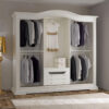 Armadio a 3 ante scorrevoli in legno massello, completo di 2 ripiano, 5 bastoni appendiabiti e una cassettiera interna a 4 cassetti.