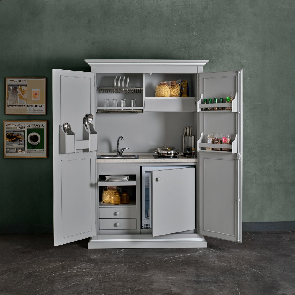 L’armadio cucina Carole è realizzato con una struttura solida in legno massello, incluse le cornici, lo zoccolo e le porte.