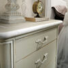 Il comodino è realizzato in legno e presenta una finitura bianca anticata che conferisce un aspetto vintage e sofisticato.