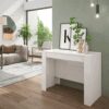 Consolle allungabile in laminato e particelle di legno rivestito in nobilitato in varie essenze di legno. Disponibile in bianco lucido e cemento.