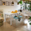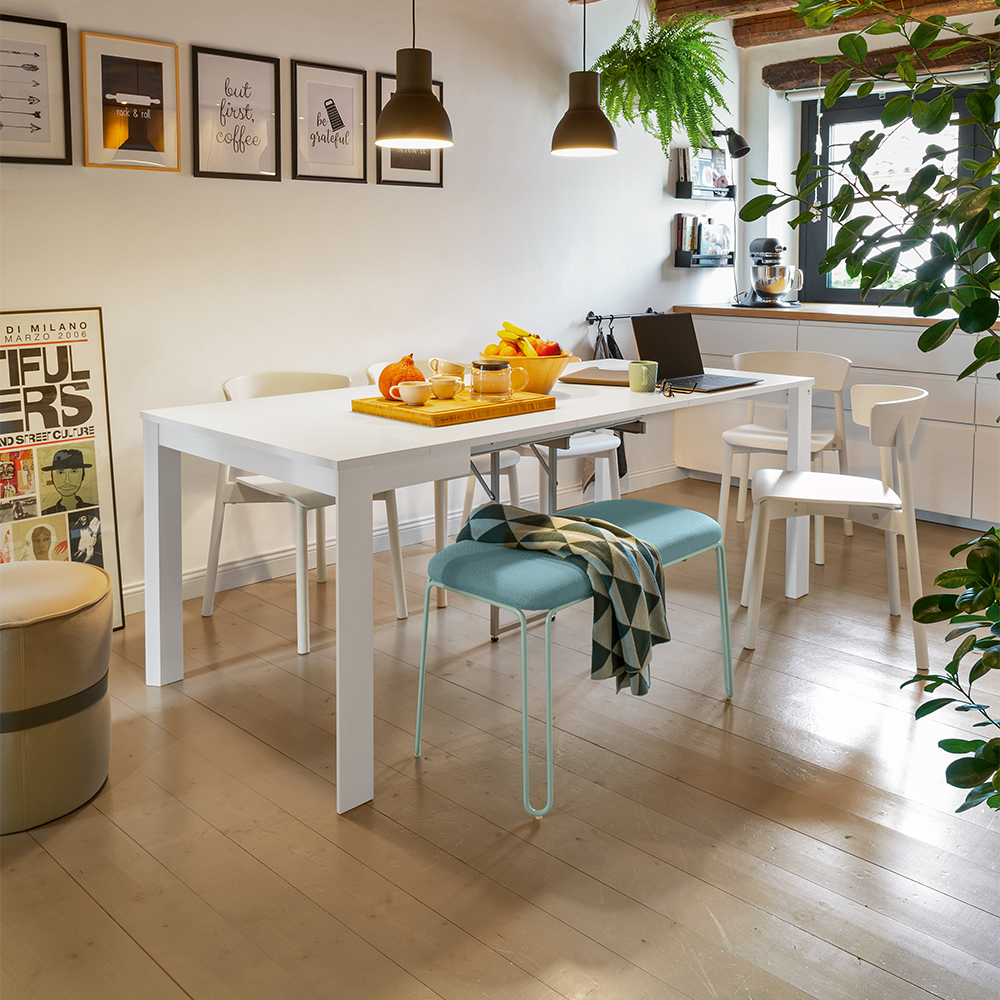 Le gambe e il cassonetto sono realizzati in faggio, mentre il piano e le allunghe sono in nobilitato, una soluzione pratica e resistente per lโuso quotidiano.