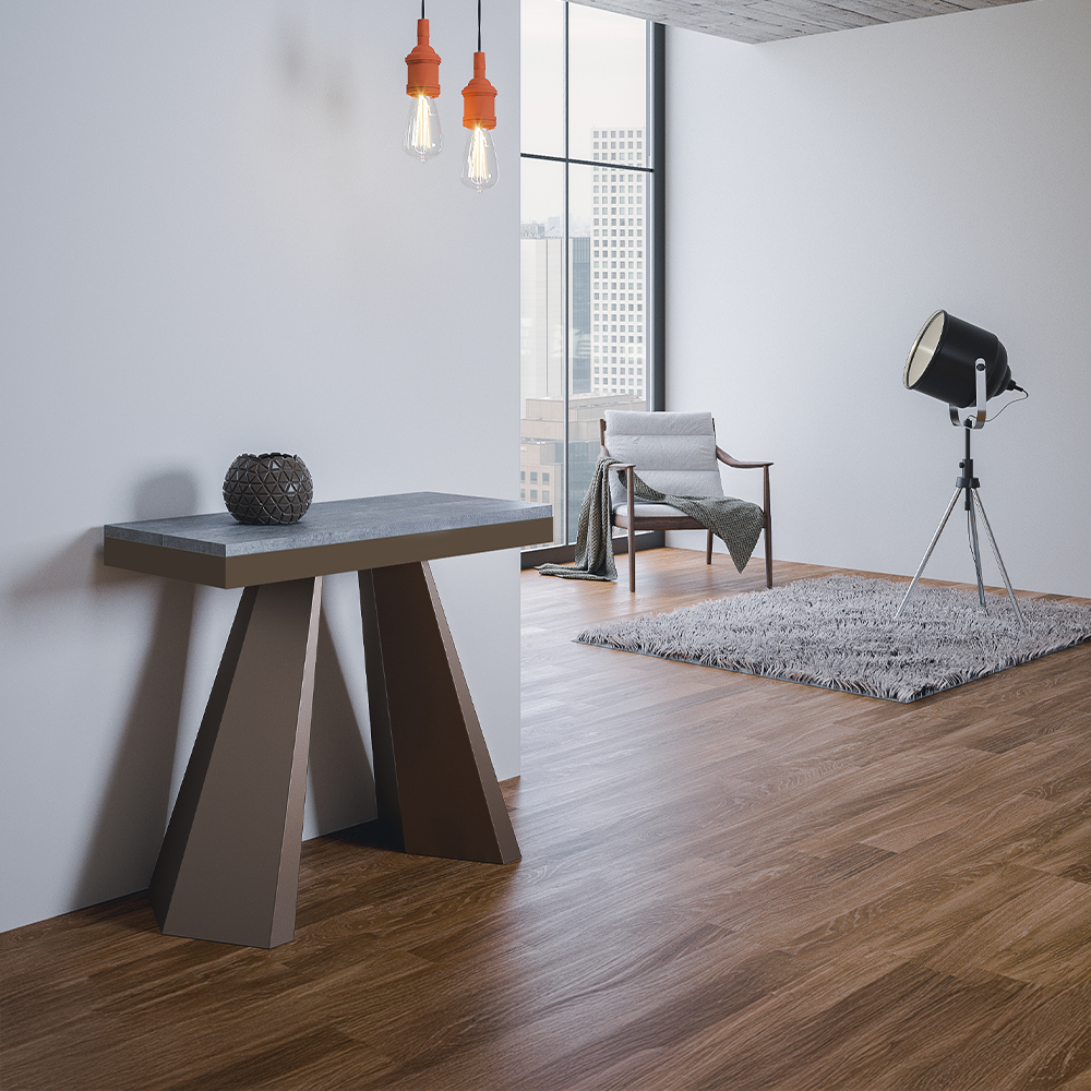 Tavolo consolle allungabile con piano in pannelli di nobilitato e gambe in ferro color marrone. Disponibile nei colori quercia naturale, bianco frassino, cemento o noce.