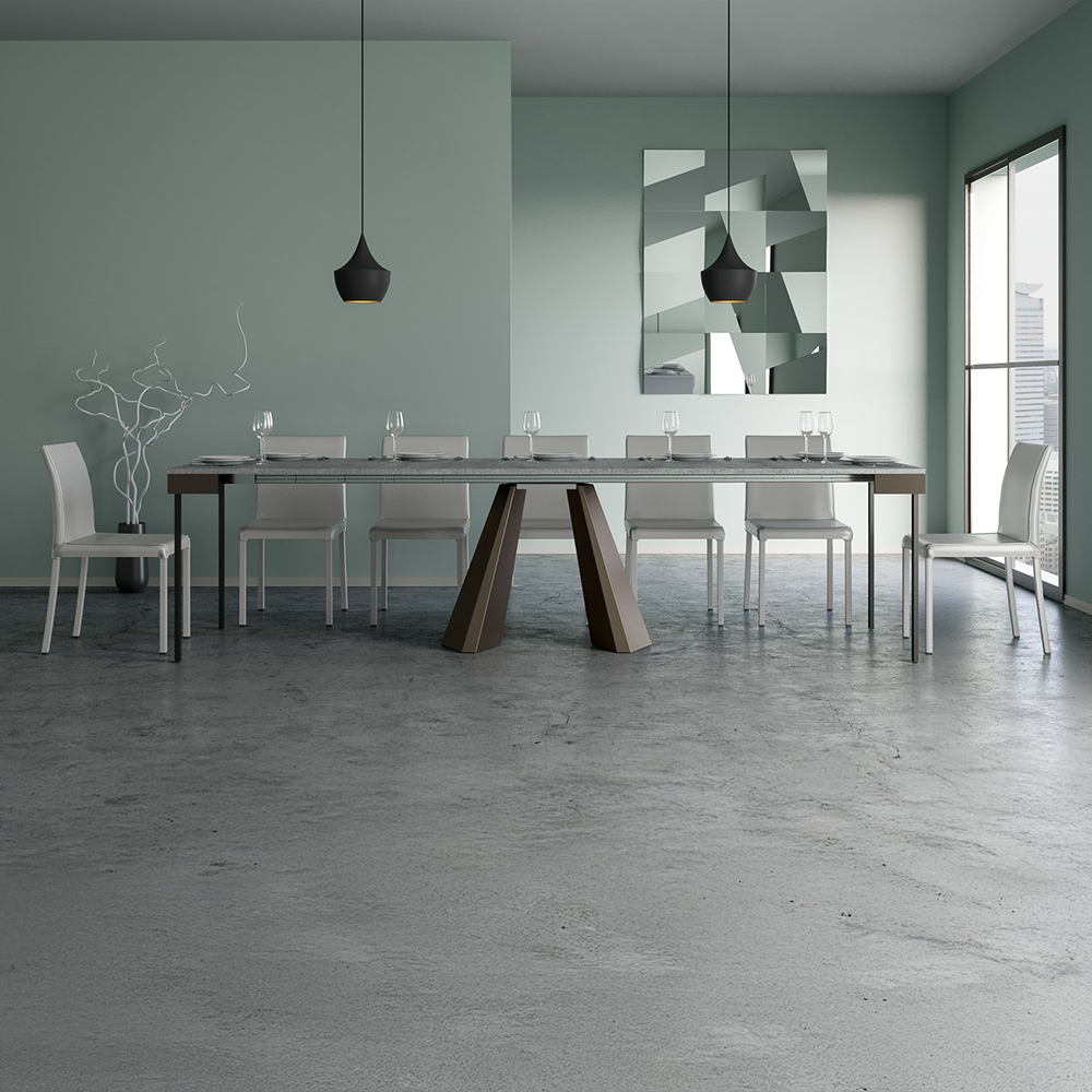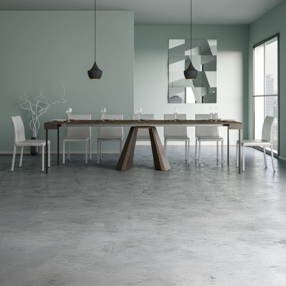 Il tavolo consolle allungabile Diamante Evolution si inserisce con naturalezza in ingresso, cucina, soggiorno o sala da pranzo e, grazie al sistema di allunghe con guide telescopiche in alluminio e al sostegno centrale incluso, si apre con semplicitร fino a raggiungere i 300 cm di lunghezza, accogliendo fino a 14 persone.