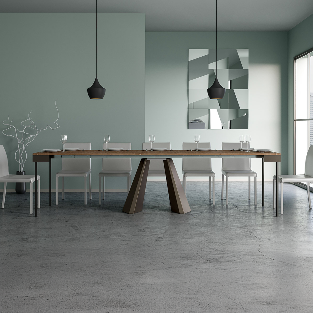 Il tavolo consolle allungabile Diamante Evolution si inserisce con naturalezza in ingresso, cucina, soggiorno o sala da pranzo e, grazie al sistema di allunghe con guide telescopiche in alluminio e al sostegno centrale incluso, si apre con semplicitร fino a raggiungere i 290 cm di lunghezza, accogliendo fino a 14 persone.