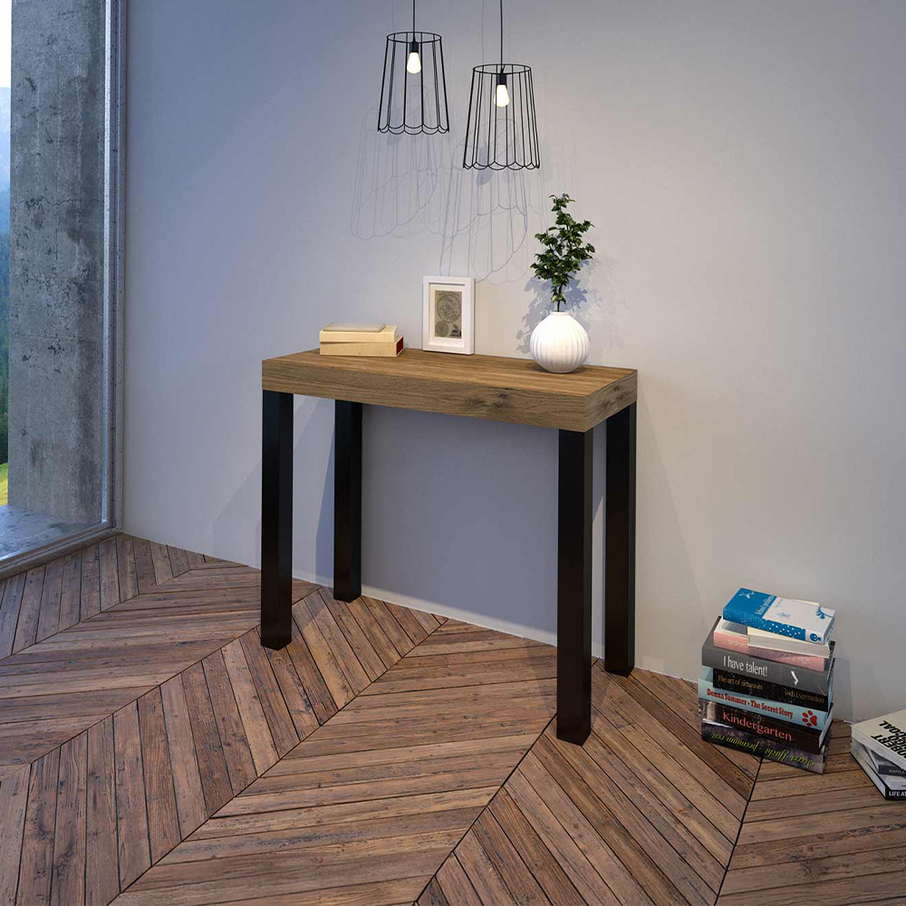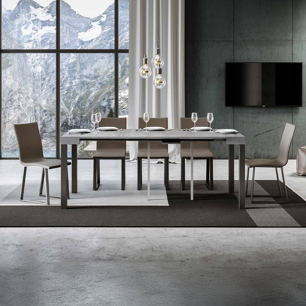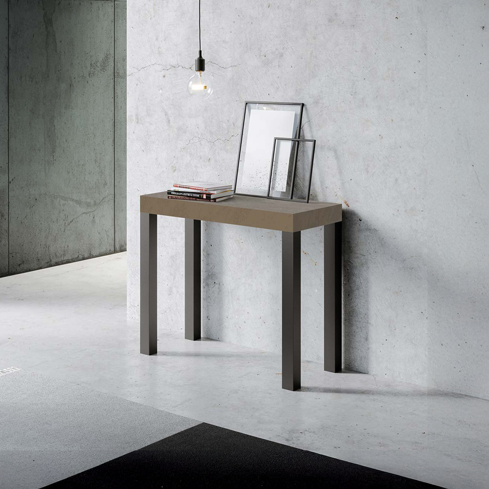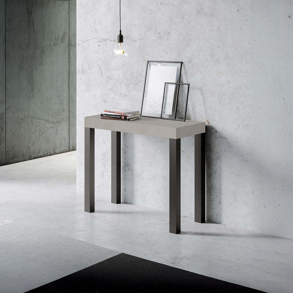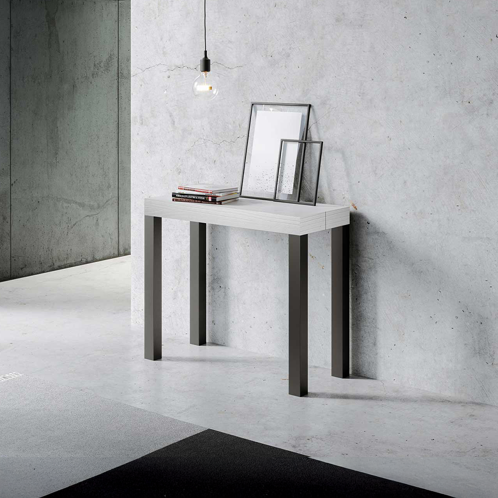 Tavolo consolle allungabile con piano in pannelli di nobilitato e gambe in ferro color antracite. Disponibile nei colori bianco frassino, quercia naturale, cemento, noce, cashmere o tortora.