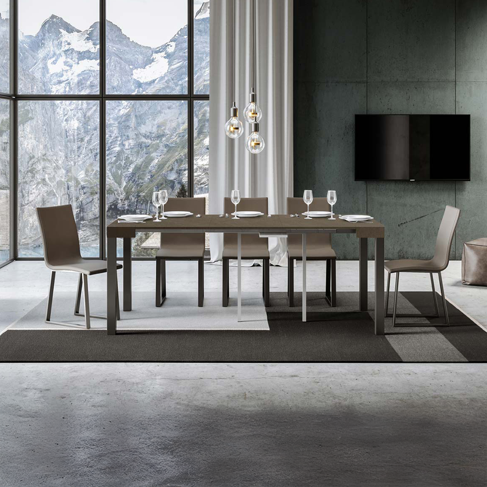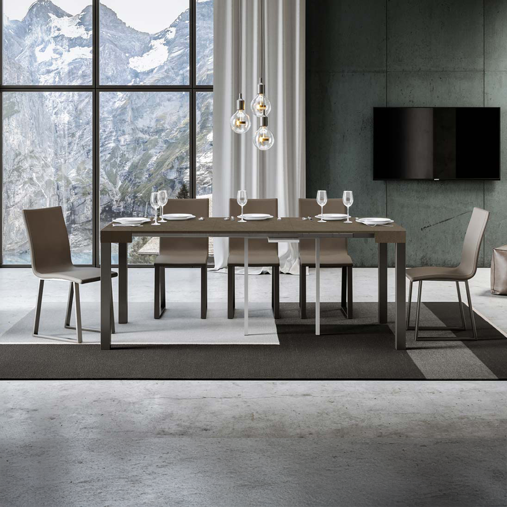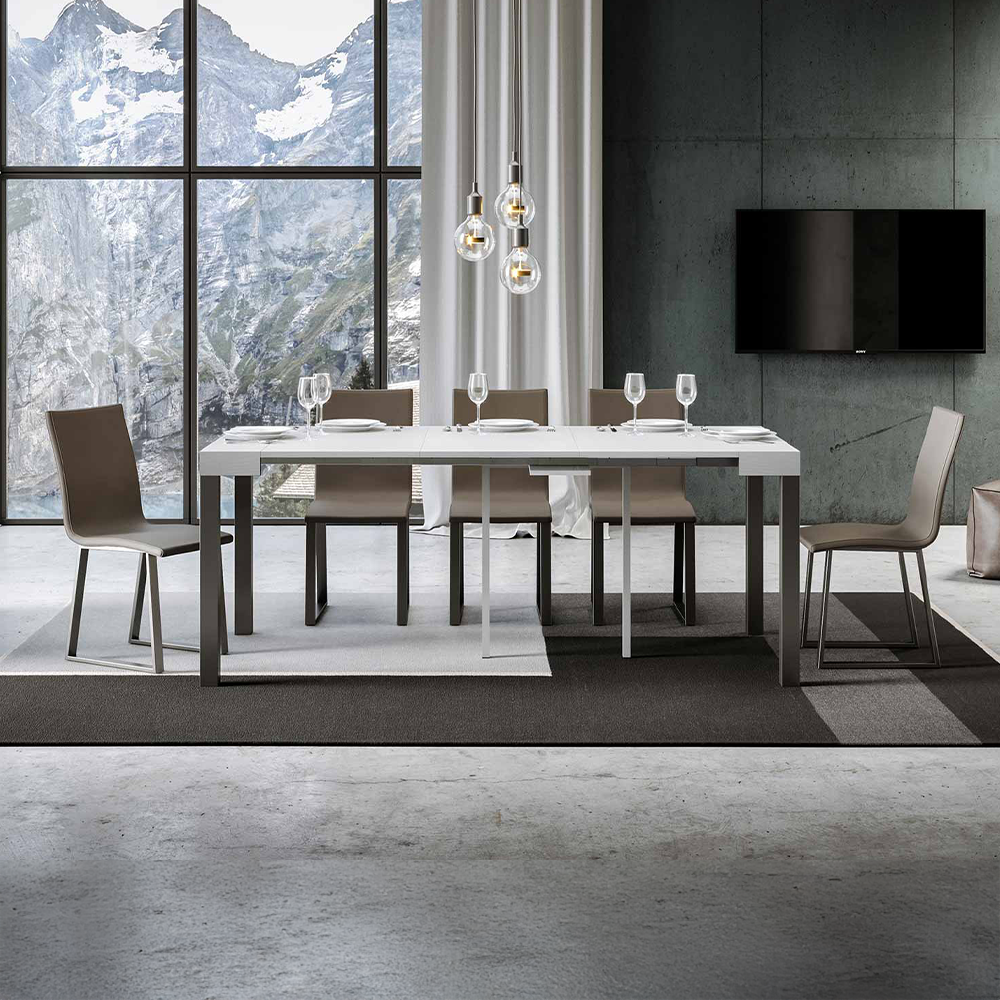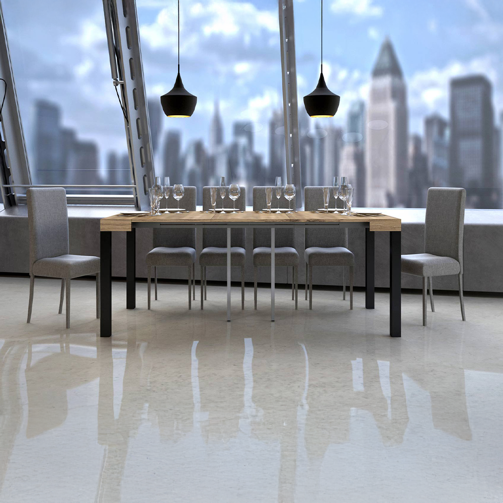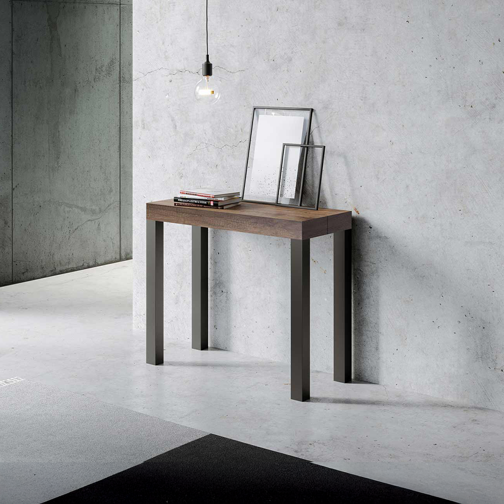 Tavolo consolle allungabile con piano in pannelli di nobilitato e gambe in ferro color antracite. Disponibile nei colori bianco frassino, quercia naturale, cemento, noce, cashmere o tortora.