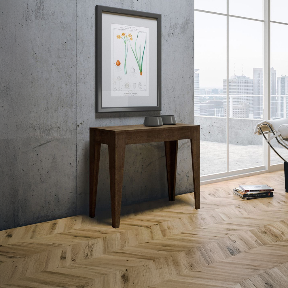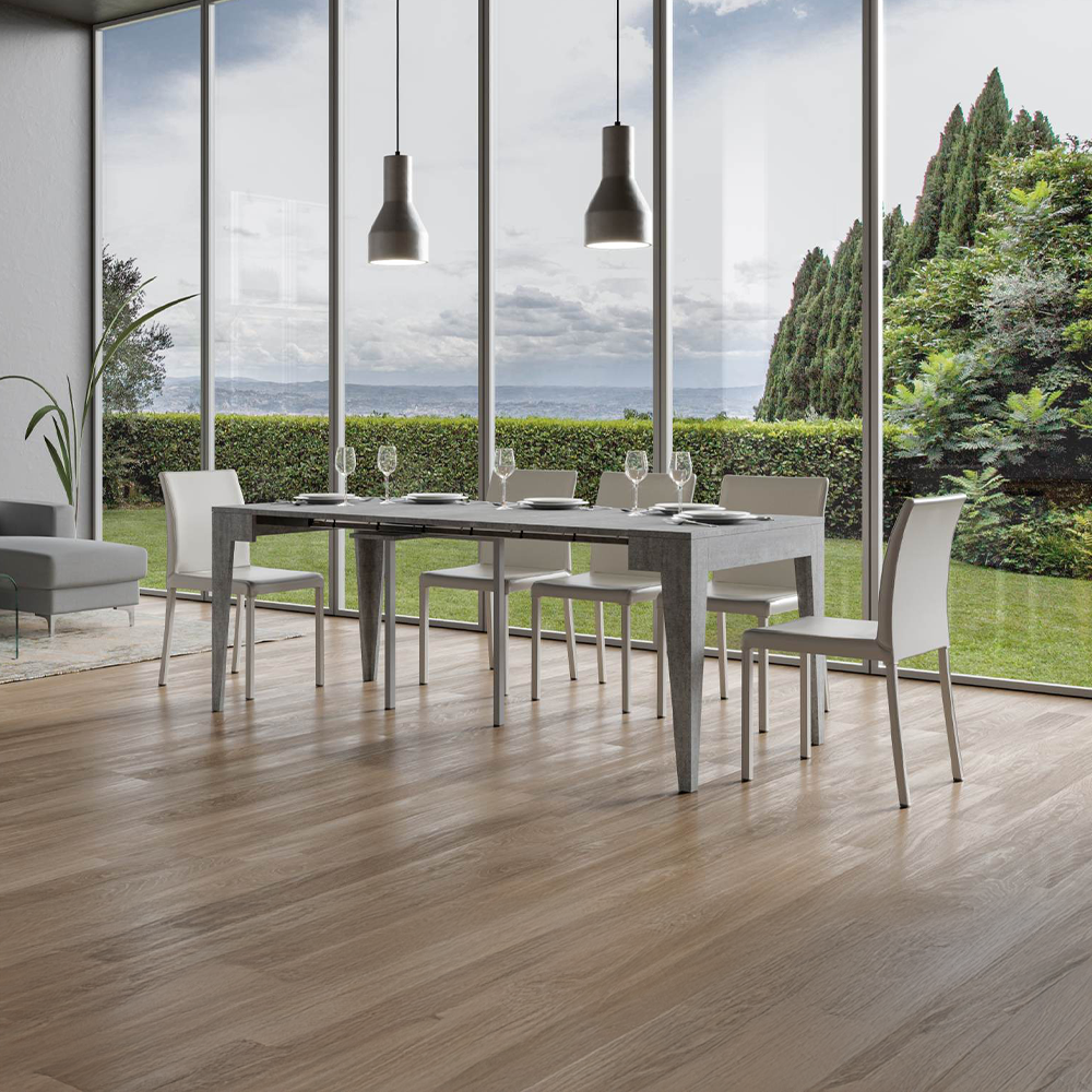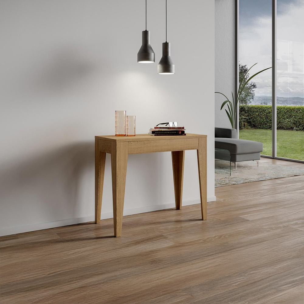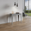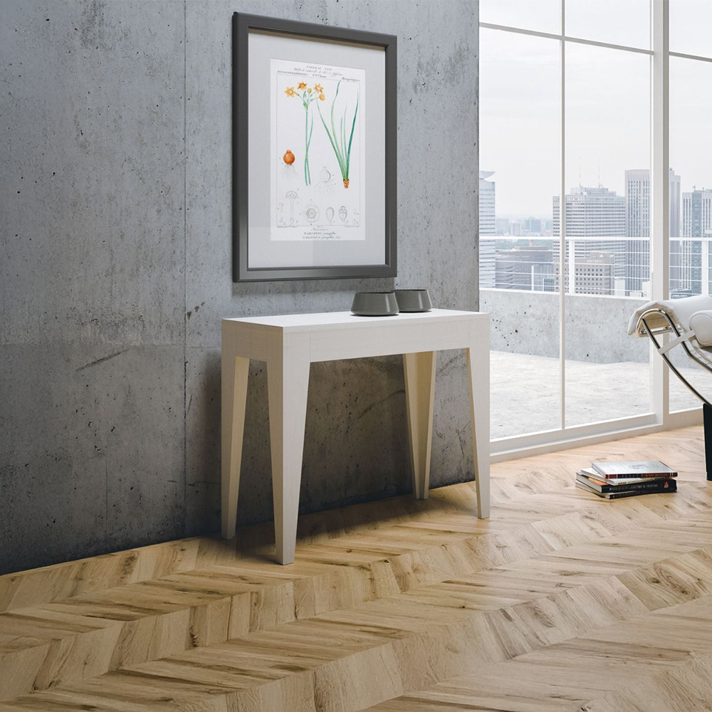Tavolo consolle allungabile realizzata in pannelli di nobilitato disponibile nei colori bianco frassino, quercia naturale, noce o cemento.