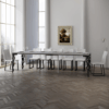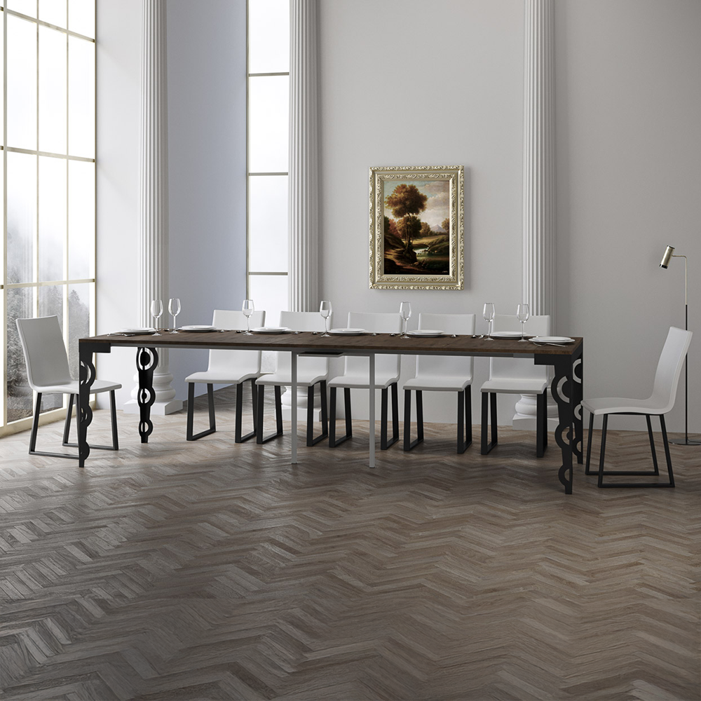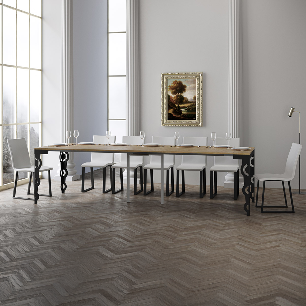 Il tavolo consolle allungabile Karamay Evolution si inserisce con naturalezza in ingresso, cucina, soggiorno, sala da pranzo o corridoio e, grazie al sistema di allunghe con guide telescopiche in alluminio e al sostegno centrale incluso, si apre con semplicitร fino a raggiungere i 300 cm di lunghezza, accogliendo fino a 14 persone.