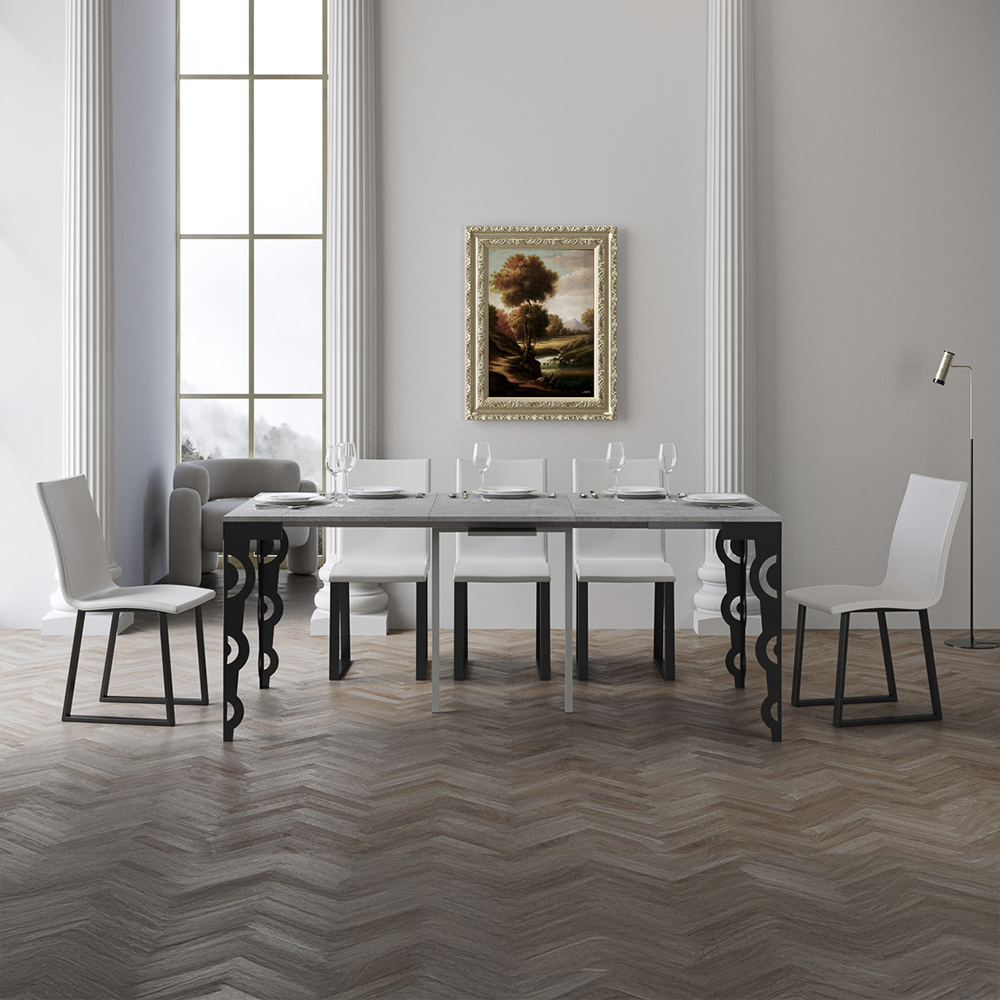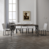 Tavolo consolle allungabile con piano in pannelli di nobilitato e gambe in ferro color antracite. Disponibile nei colori bianco frassino, quercia naturale, cemento o noce.
