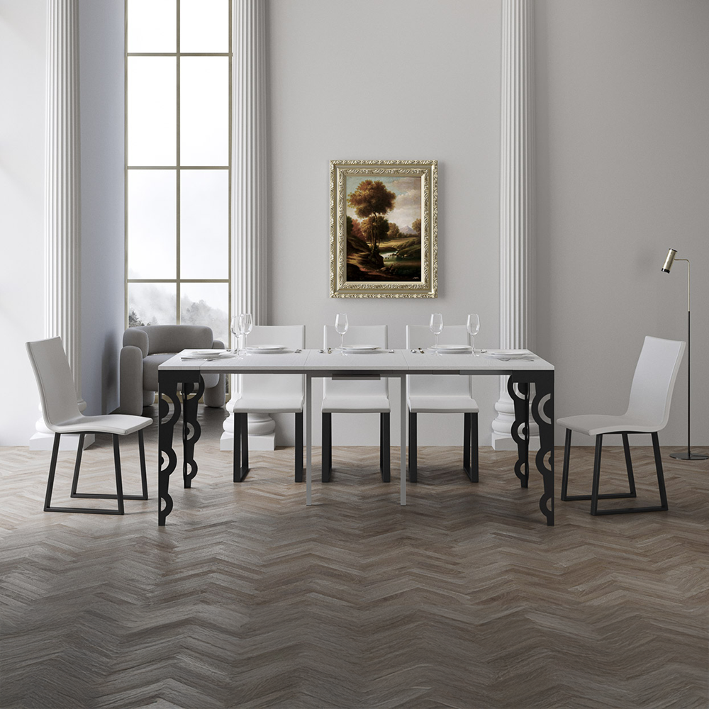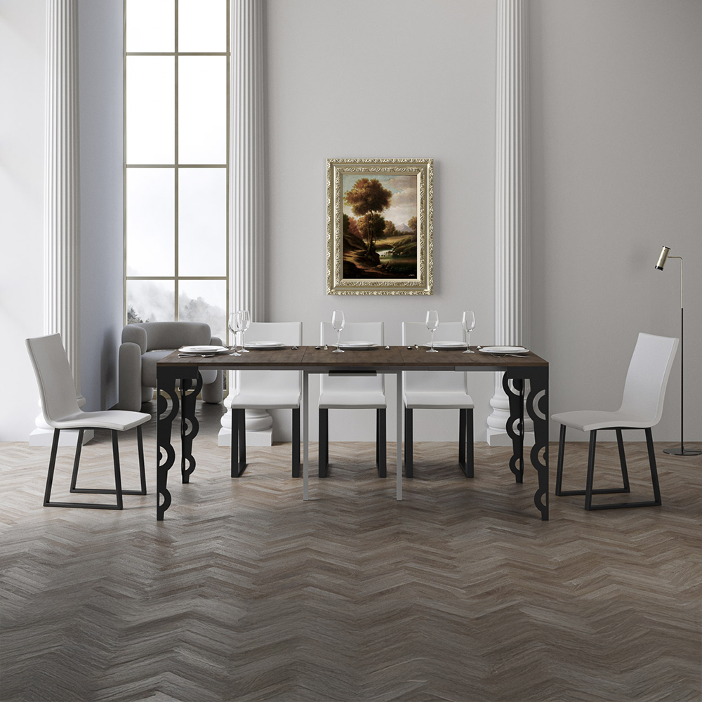 Il tavolo consolle allungabile Karamay Small Evolution si inserisce con naturalezza in ingresso, cucina, soggiorno, sala da pranzo o corridoio e, grazie al sistema di allunghe con guide telescopiche in alluminio e al sostegno centrale incluso, si apre con semplicitร fino a raggiungere i 196 cm di lunghezza, accogliendo fino a 10 persone.