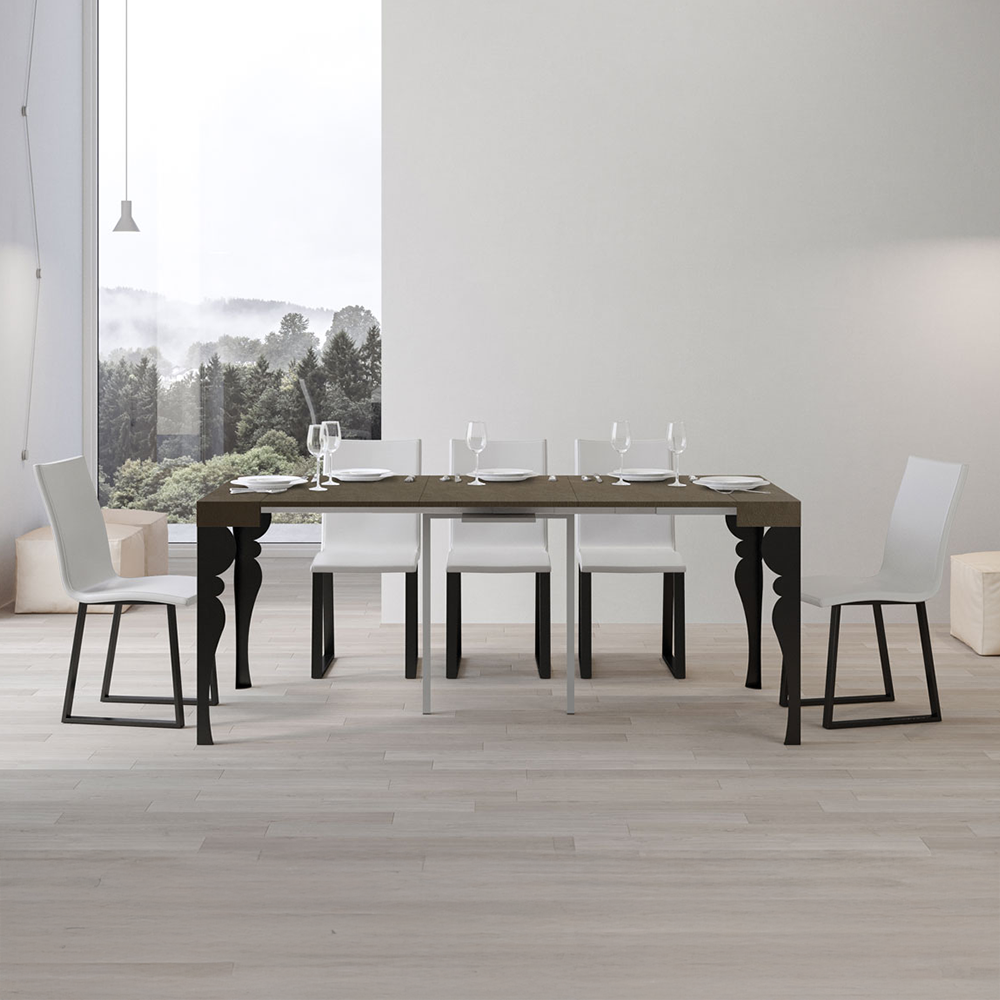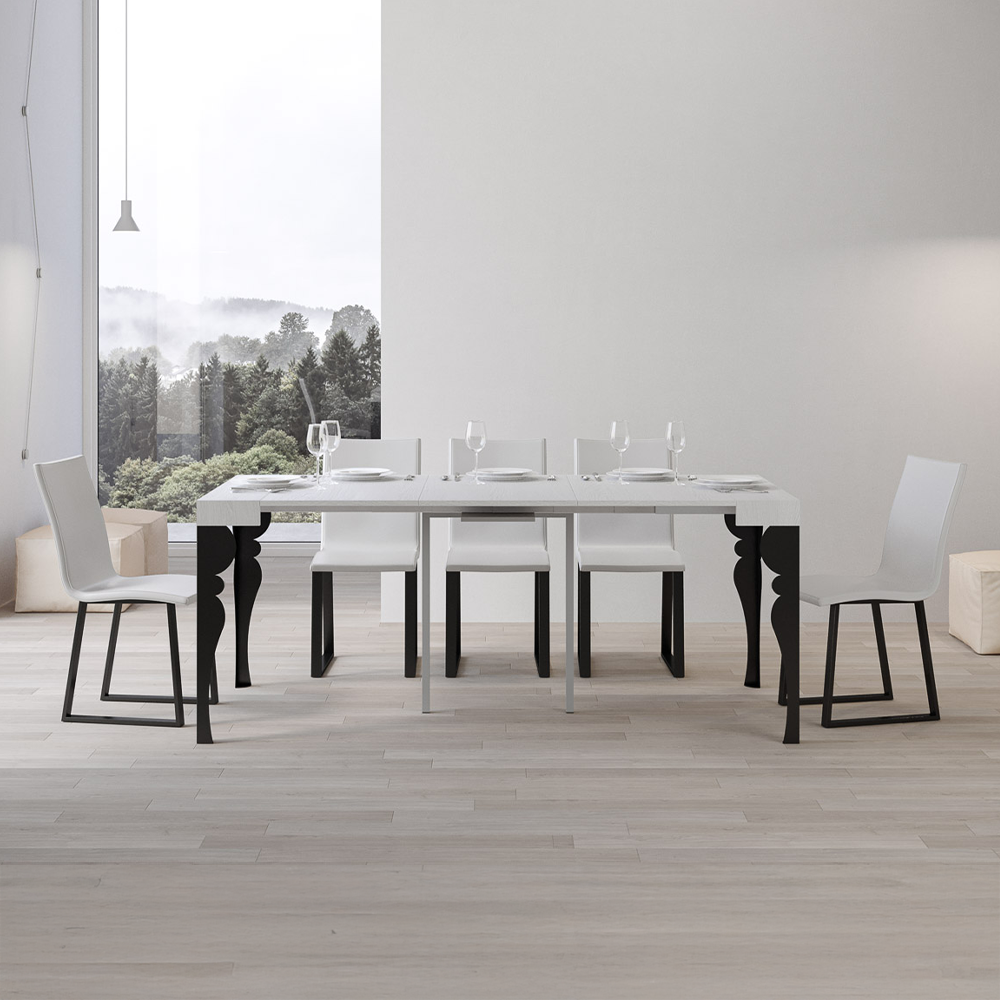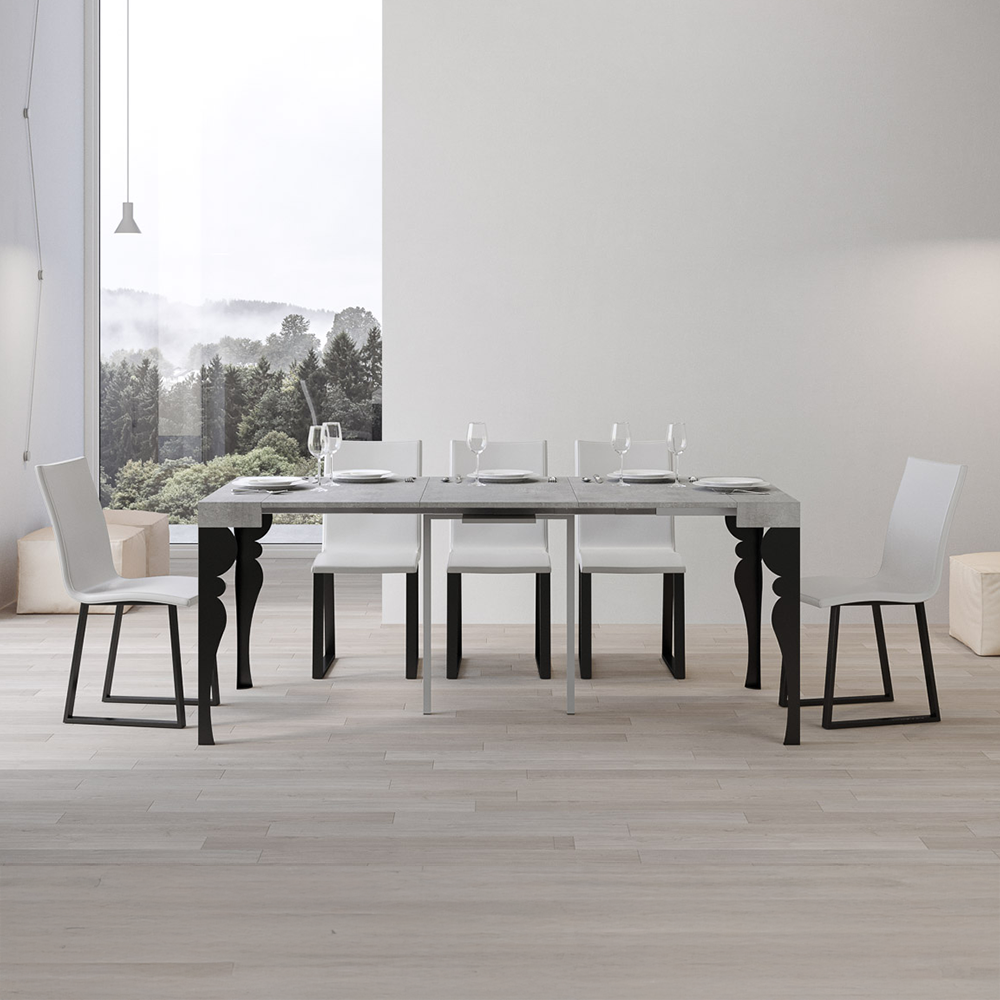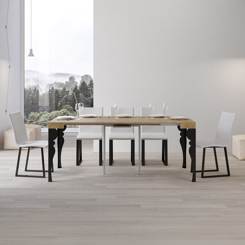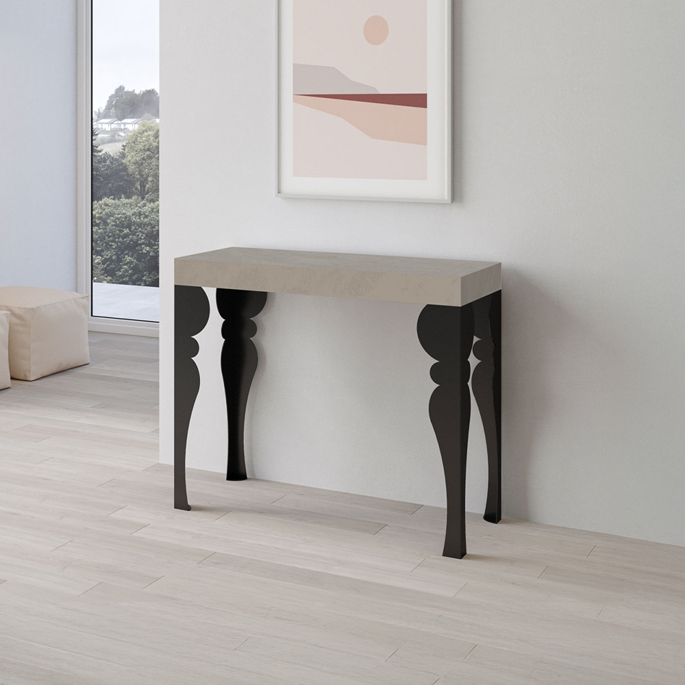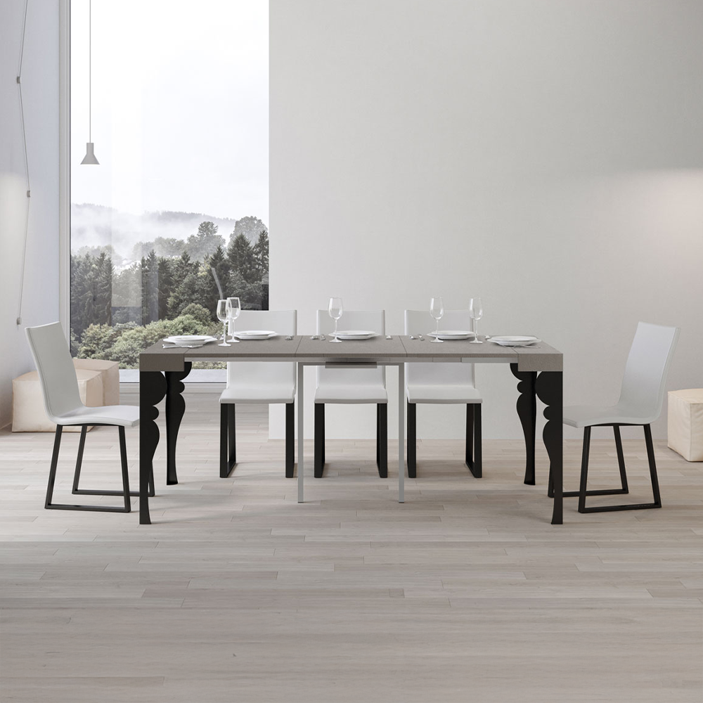 Tavolo consolle allungabile con piano in pannelli di nobilitato e gambe in ferro color antracite. Disponibile nei colori bianco frassino, quercia naturale, cemento, noce, cashmere o tortora.