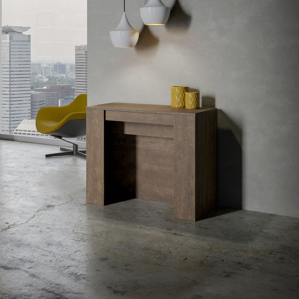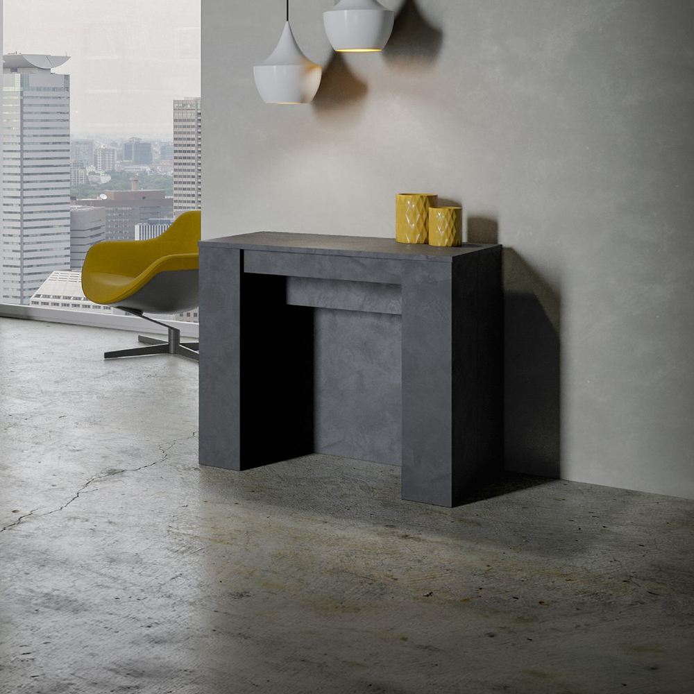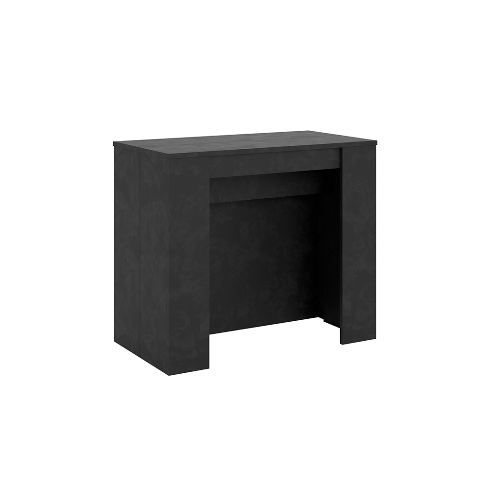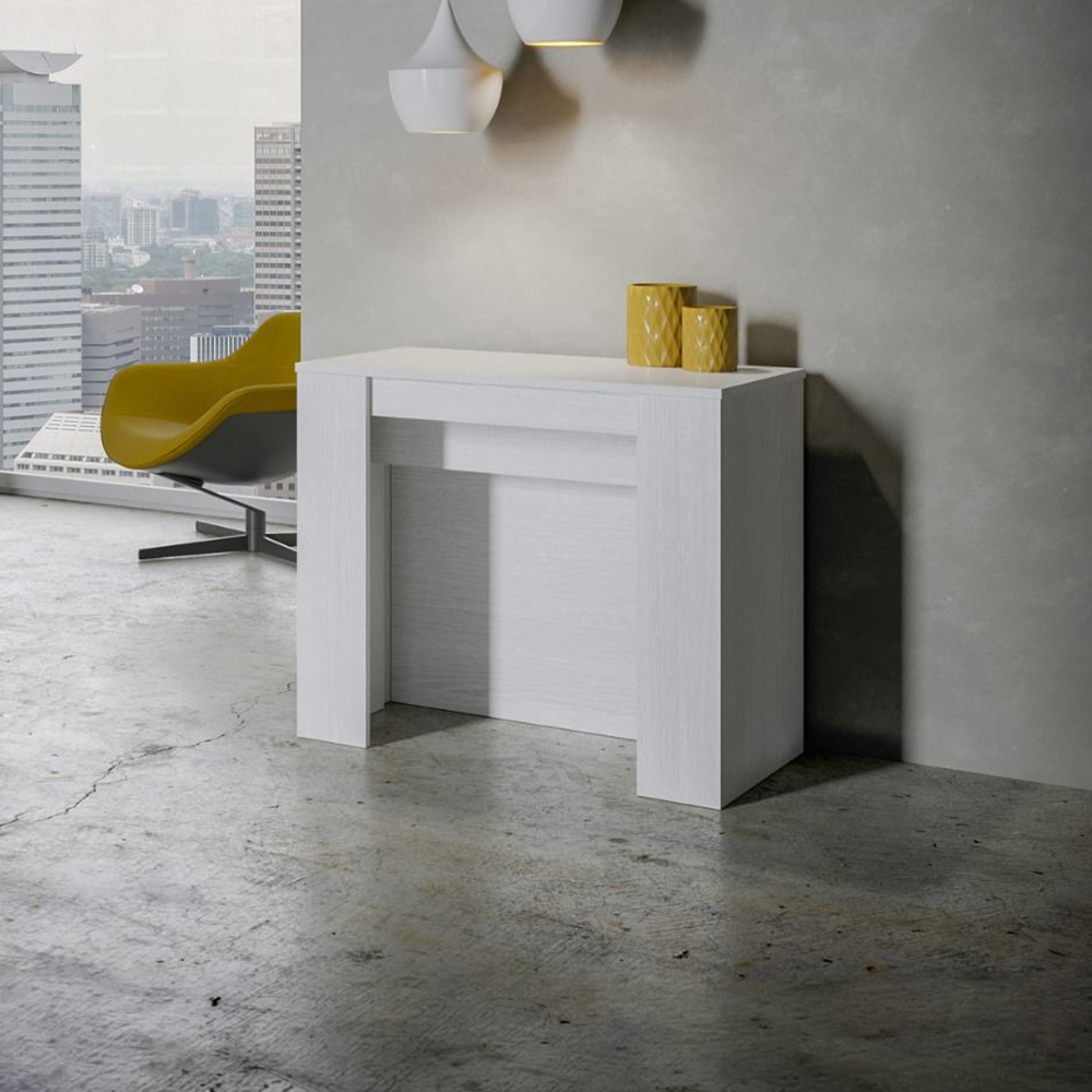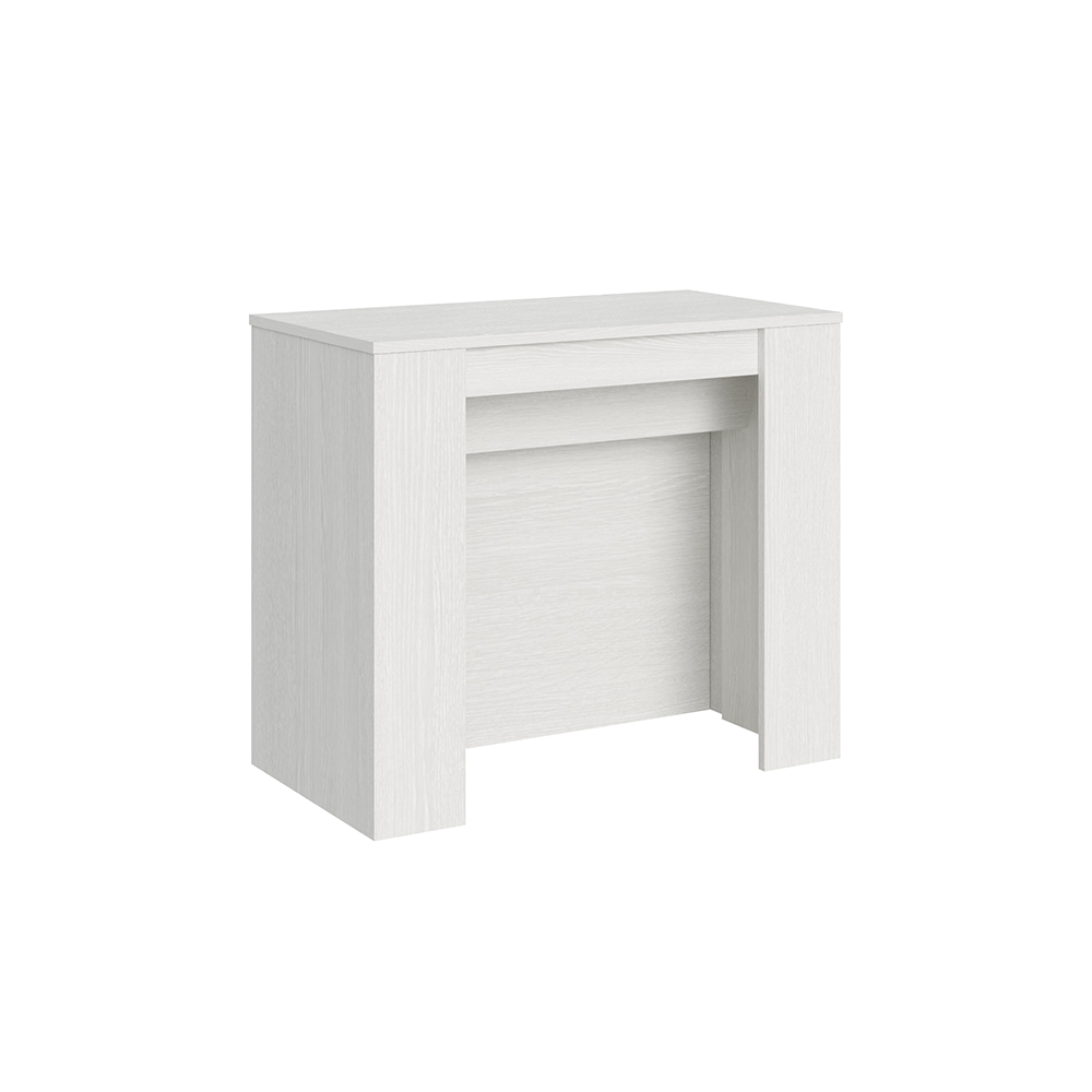 Tavolo consolle allungabile in pannelli di nobilitato. Disponibile nei colori bianco frassino, quercia naturale, noce o antracite spatolato.