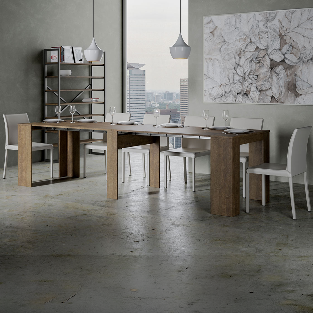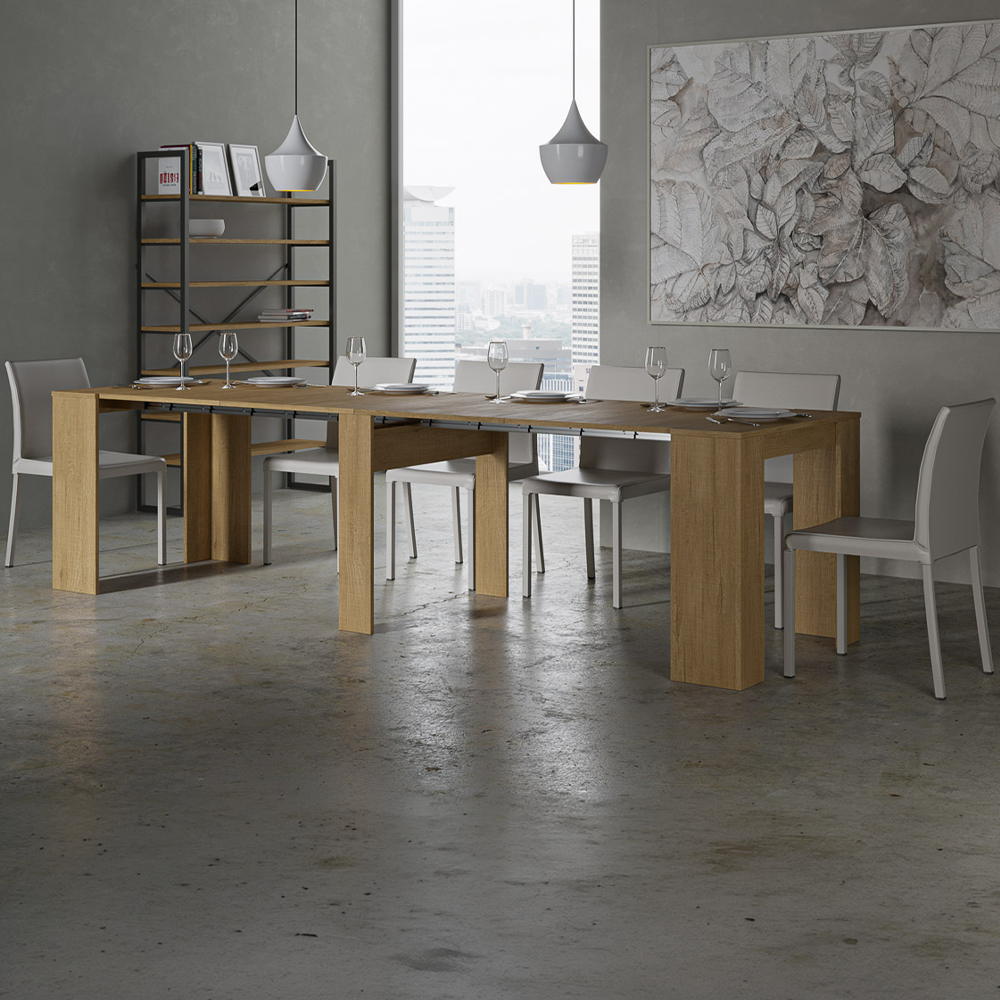 Il tavolo consolle allungabile Venus si inserisce con naturalezza in ingresso, cucina, soggiorno, sala da pranzo o corridoio e, grazie al sistema di allunghe con guide telescopiche in alluminio e al sostegno centrale incluso, si apre con semplicitร fino a raggiungere i 296 cm di lunghezza, accogliendo fino a 14 persone.