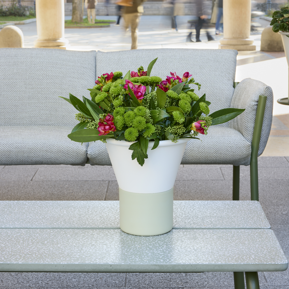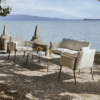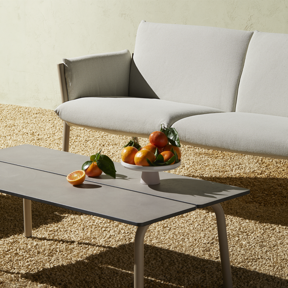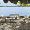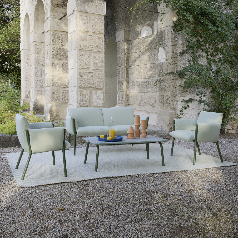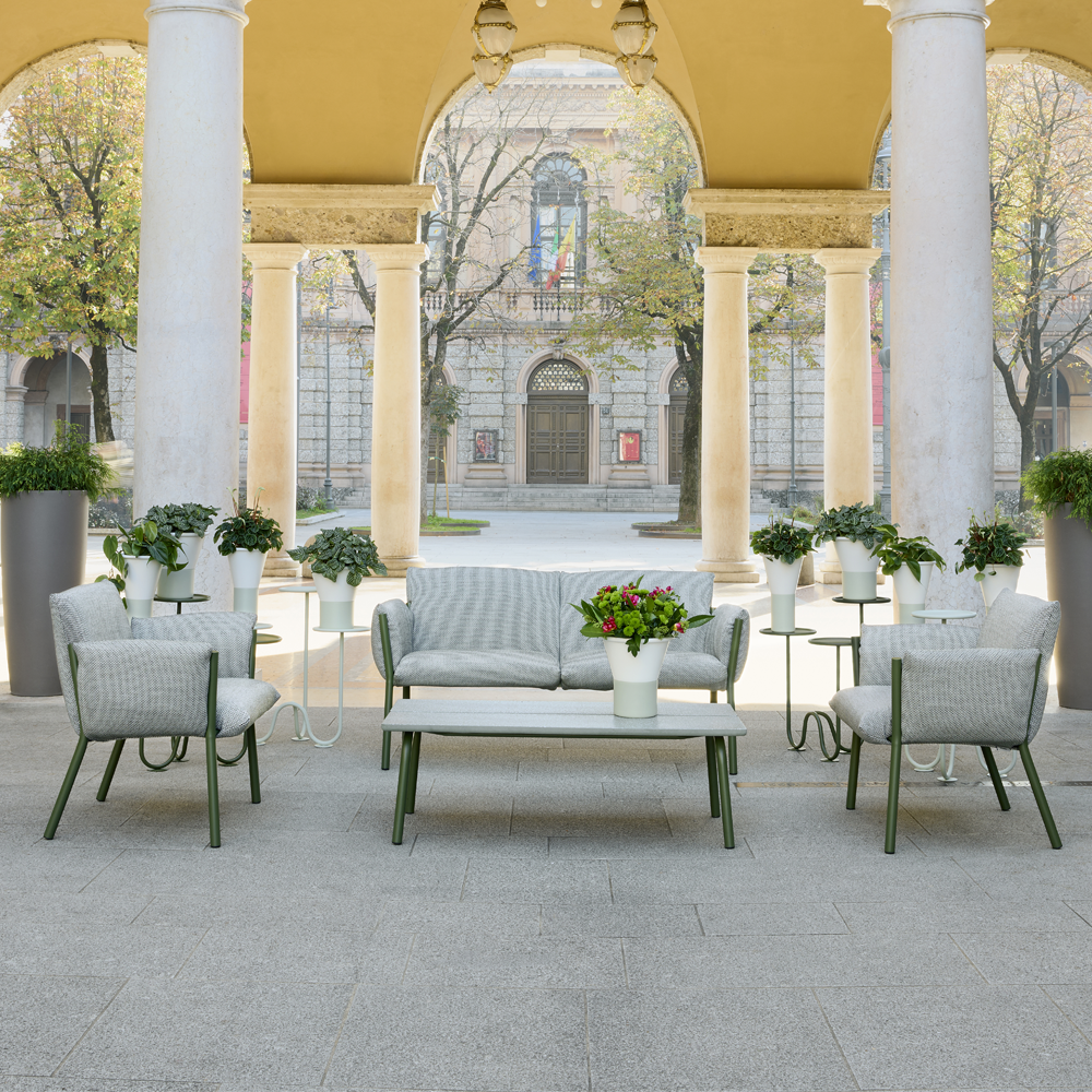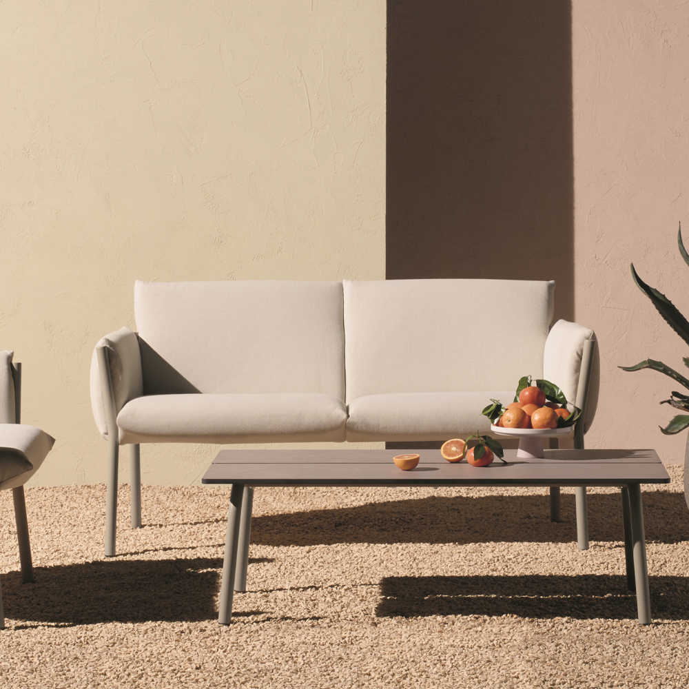 Divano outdoor con seduta imbottita in più tipologie di tessuto e struttura in acciaio verniciato.