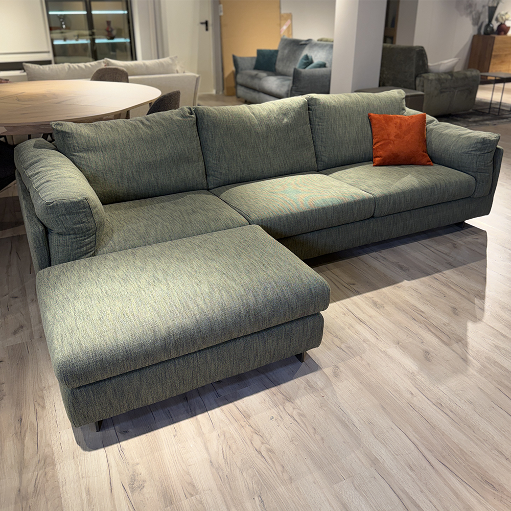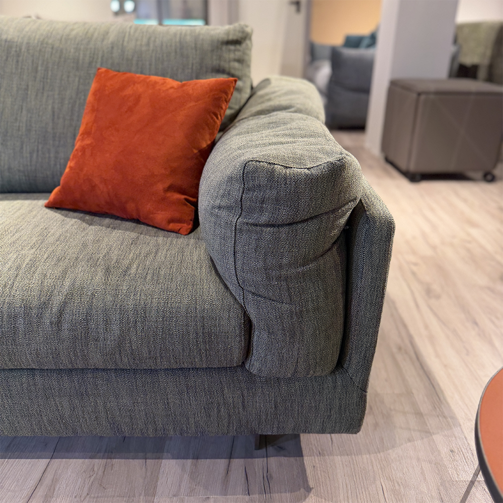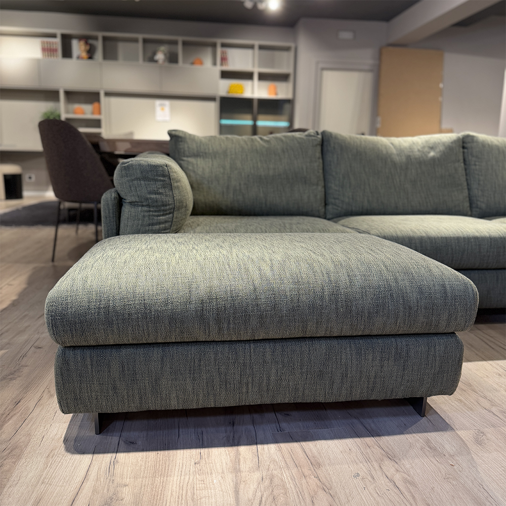 Il divano Zeno รจ un tre posti con pouf pensato per offrire comfort pieno e una presenza decisa in ogni ambiente.