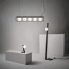 Suspense Cย diย Midjย รจ un lampadario a luce diffusa diretta conย struttura a rettangolo in metallo neroย che racchiude le cinque sfere-diffusori realizzate in vetro soffiato a bocca. Le sfere in vetro satinato scorrono all’interno della struttura rettangolare in un esercizio di forme senza tempo. Il lampadario verrร fissato al soffitto tramiteย due cavi di sospensione in acciaioย a fissaggio meccanico, ilย cavo elettrico รจ rivestito in seta nera.