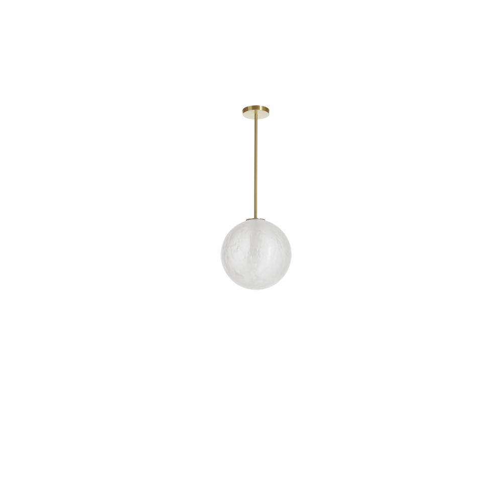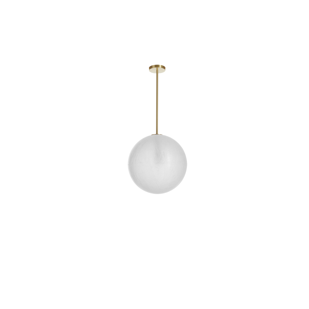 Lampadario con paralume in SAN trasparente con effetto vetro soffiato e stelo in ottone satinato o polietilene bianco laccato opaco.