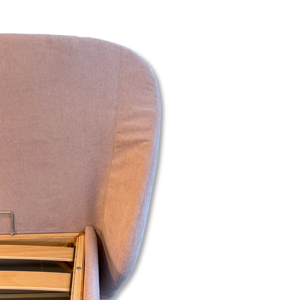 Letto contenitore matrimoniale con testata e giroletto rivestiti in tessuto rosa sfoderabile, rete in legno di faggio e piedini in polipropilene bianco sporco.