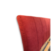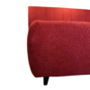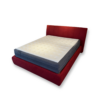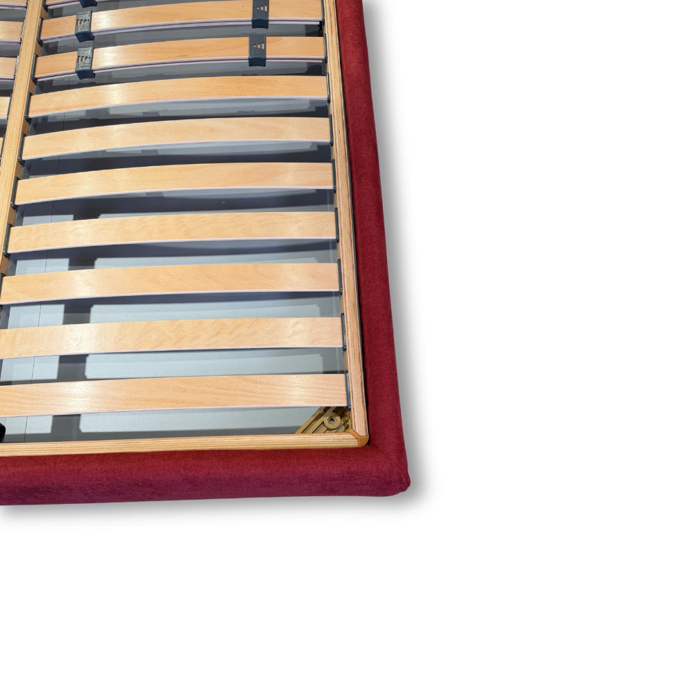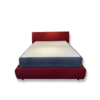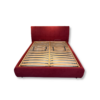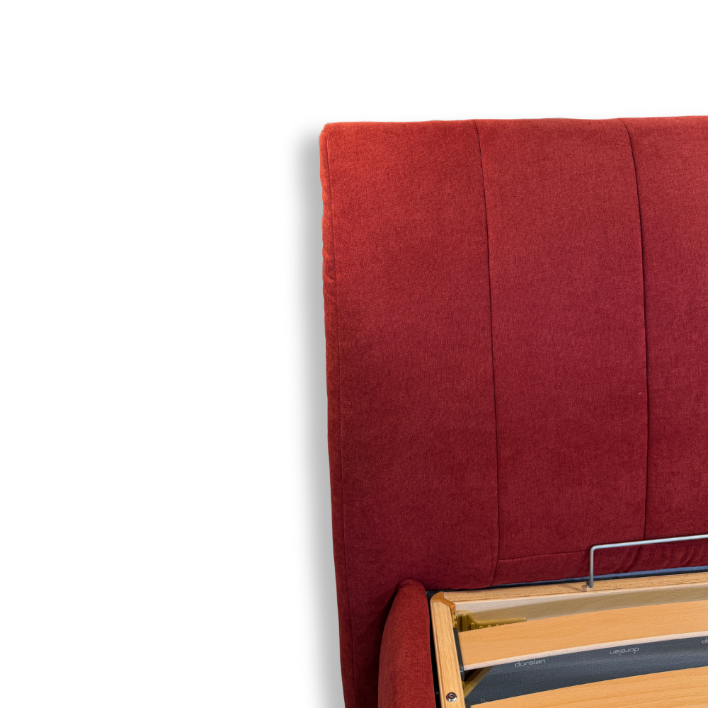 Letto contenitore matrimoniale con testata e giroletto rivestiti in tessuto rosso idrorepellente, rete in legno di faggio e piedini in legno wengé.
