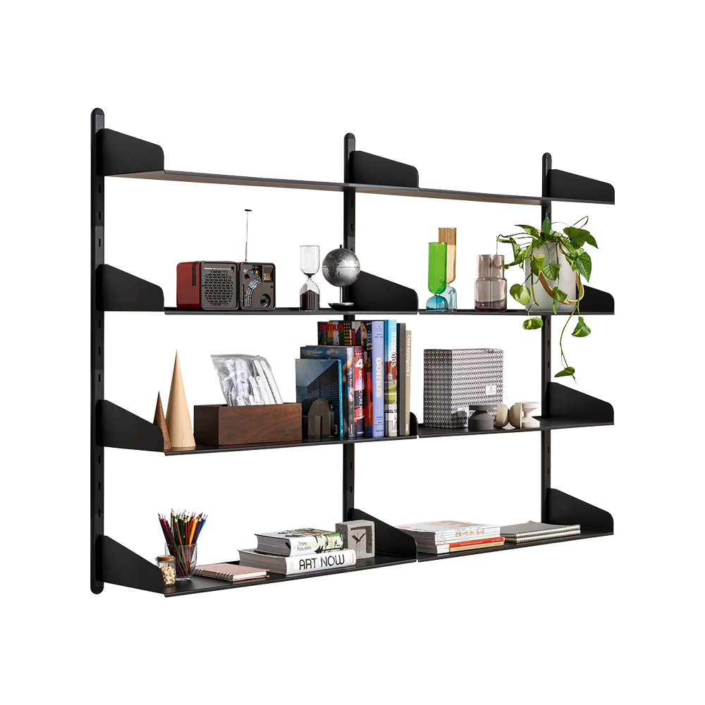 Disponibile nelle finiture nero opaco o bianco ottico opaco, si adatta a diversi contesti abitativi, dal soggiorno allo studio, permettendo di sfruttare lo spazio verticale con ordine e leggerezza visiva.