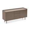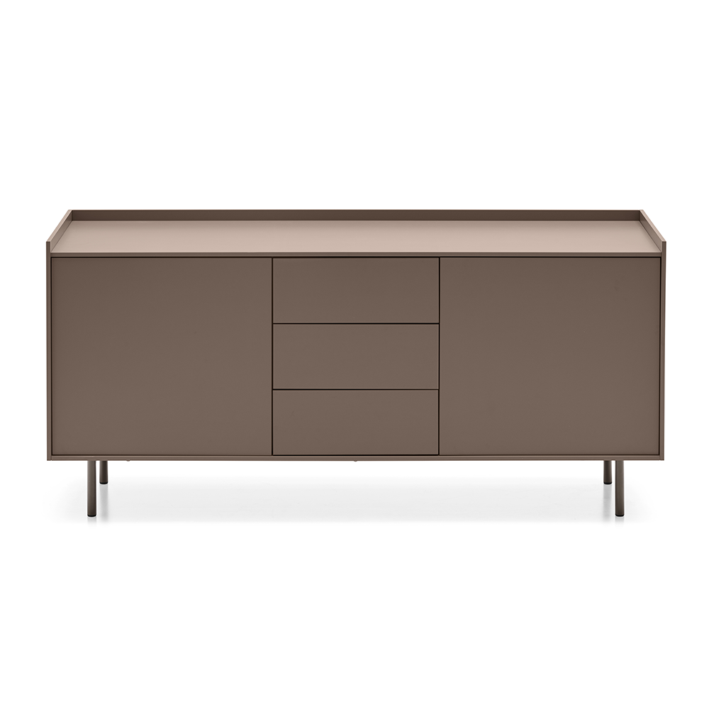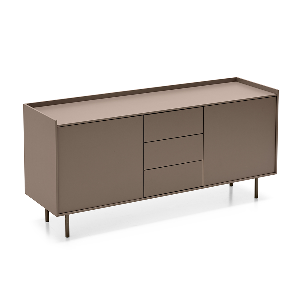 La struttura, il top, le due ante laterali e i tre cassetti centrali in laccato definiscono un volume compatto e funzionale, sostenuto da piedini in metallo che ne slanciano la forma.