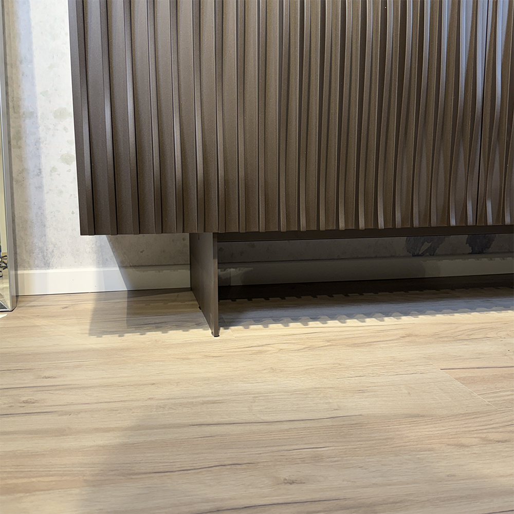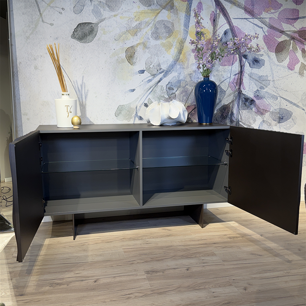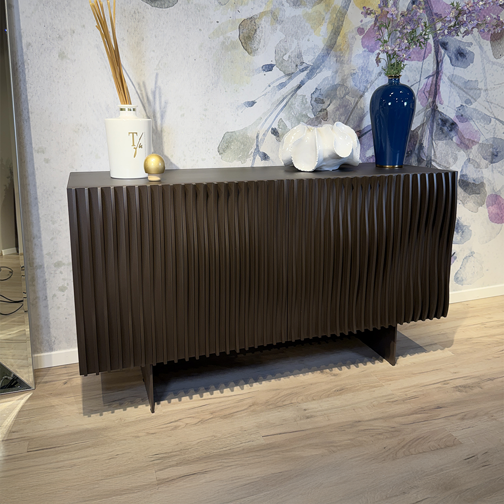 La madia Flusso presenta una struttura in legno laccato bronzo opaco e si distingue per le due ante caratterizzate da linee geometriche ondulate, che creano un effetto visivo dinamico e originale.