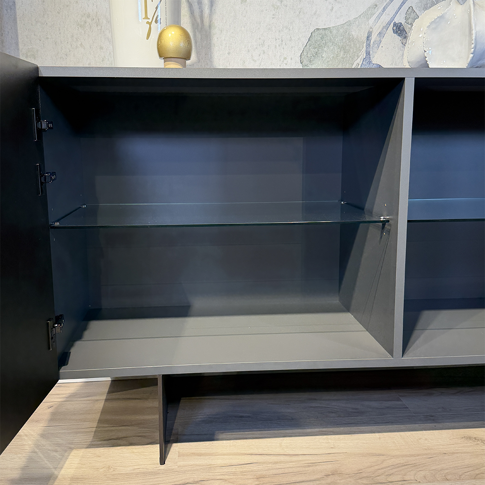 Madia in legno laccato bronzo opaco con 2 ante, ripiani in vetro e piedini in metallo.