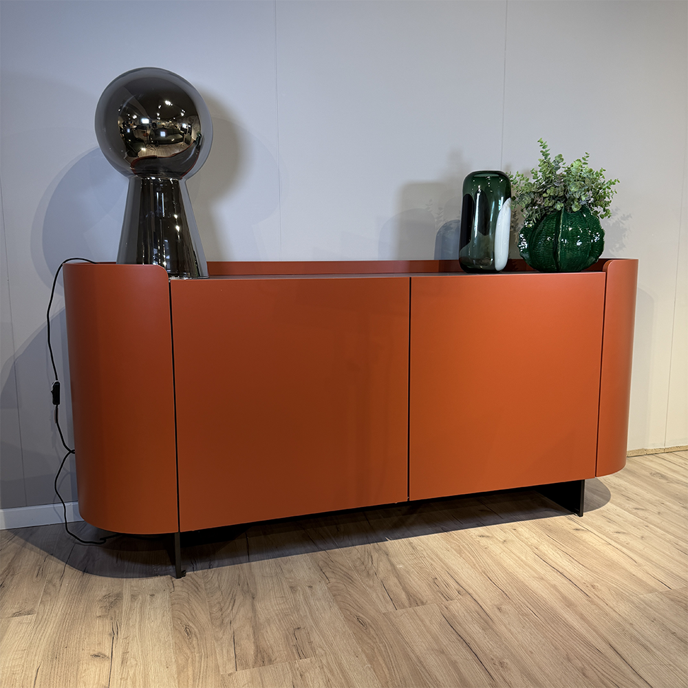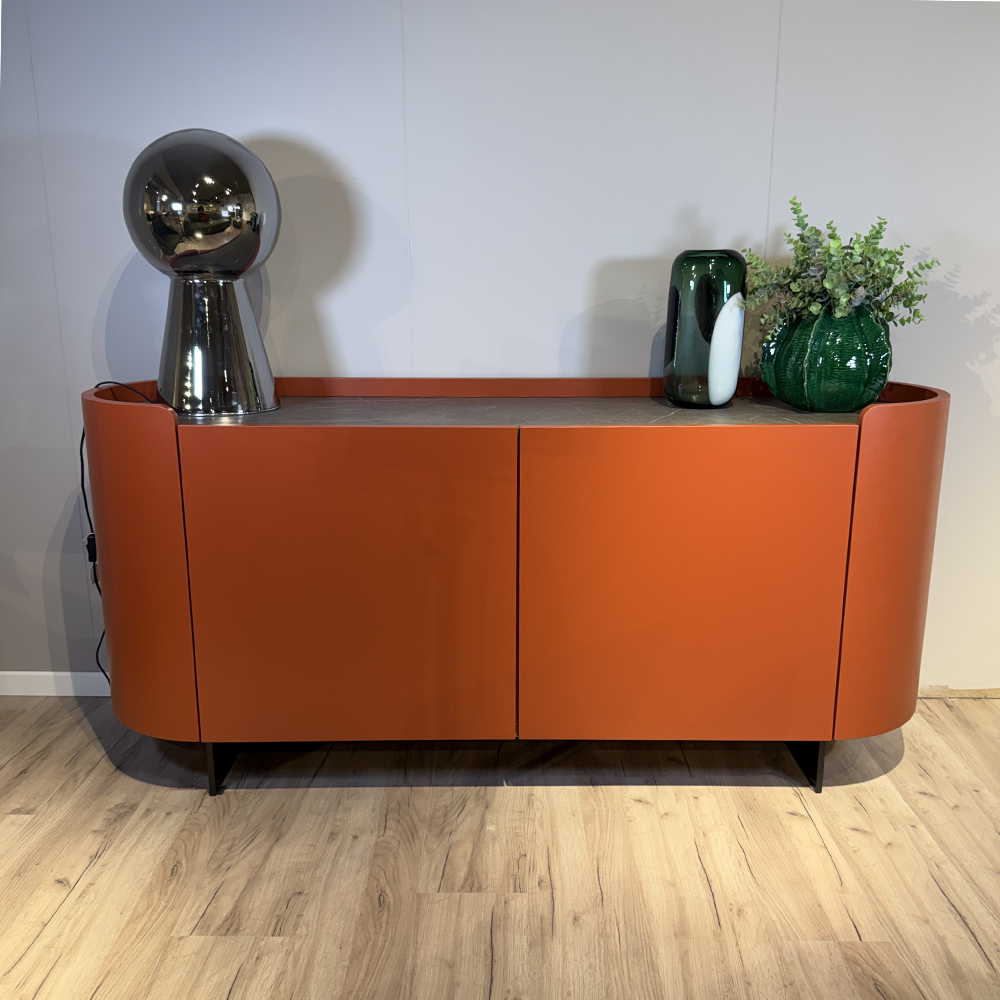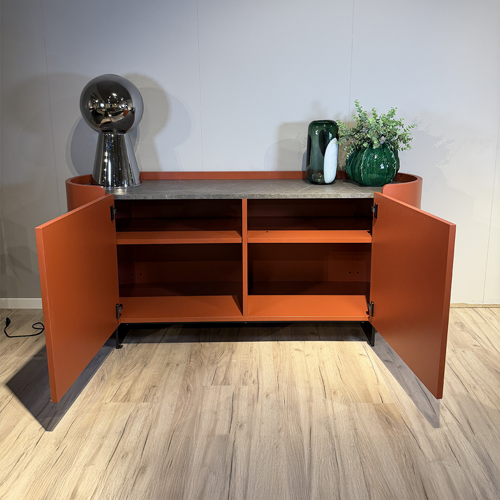 Madia a 2 ante con struttura e frontali in legno multistrato laccato in terra di Siena opaco, piano in marmo grafite e piedini in metallo.
