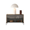 Madia con 2 ante battenti in vetro o legno massello di rovere. Struttura in rovere impiallacciato, fianchi in legno massello di rovere e piedini in ferro.