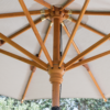 Ombrellone a palo centrale in essenza di toulipier con stecche in essenza di toulipier, corona e puntale in essenza di ontano, apertura a carrucola e base in cemento graniglia.