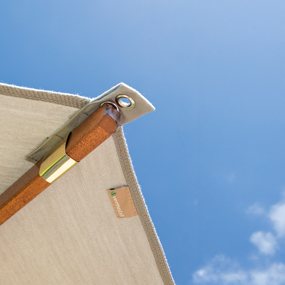 Realizzato con palo centrale in essenza di toulipier, è dotato di stecche a sgancio rapido nello stesso materiale, progettate per garantire praticità e resistenza nel tempo.