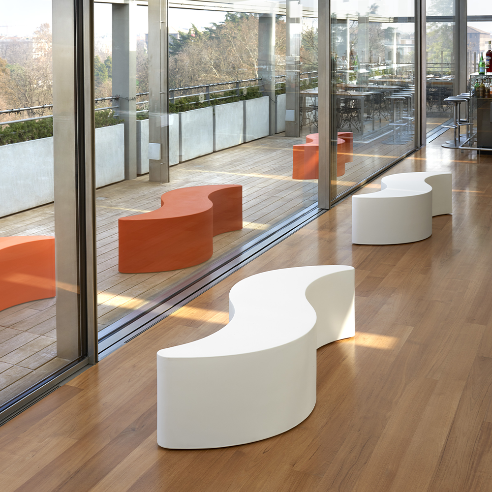 La panca Wave, dalla caratteristica forma a onda, è pensata per aggiungere movimento e dinamismo a spazi interni ed esterni.