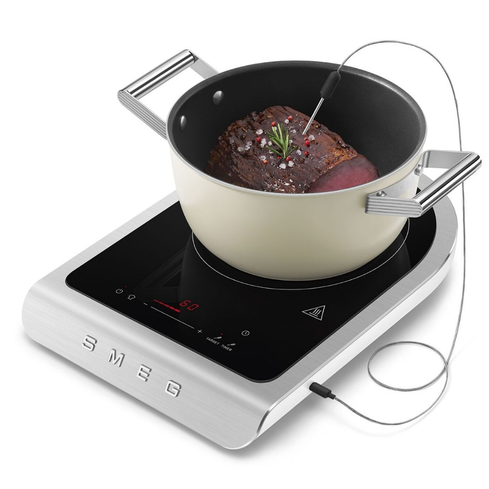 La piastra a induzione portatile Smeg permette di cucinare con prestazioni di livello professionale anche fuori dalla cucina tradizionale.