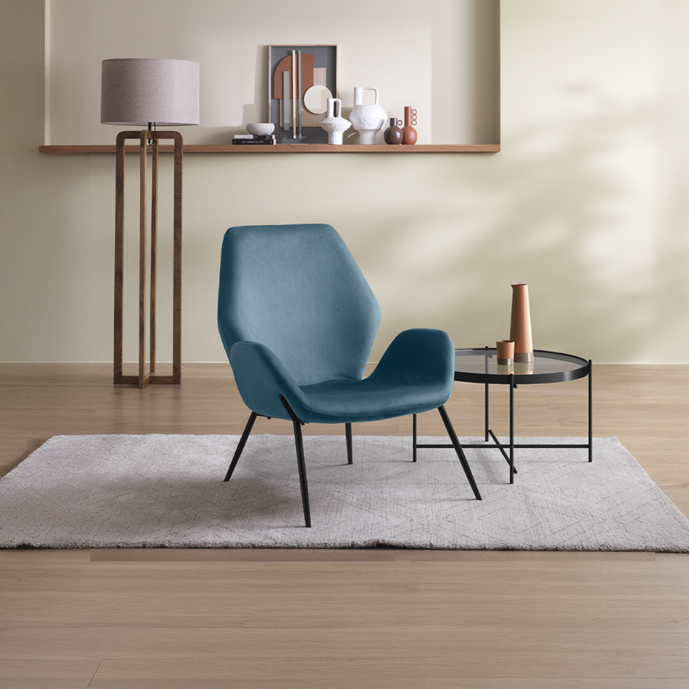 La struttura in metallo verniciato nero sostiene una seduta imbottita, rivestita in velluto morbido e piacevole al tatto, disponibile nei colori verde scuro, blu, antracite o caramello.