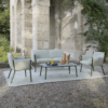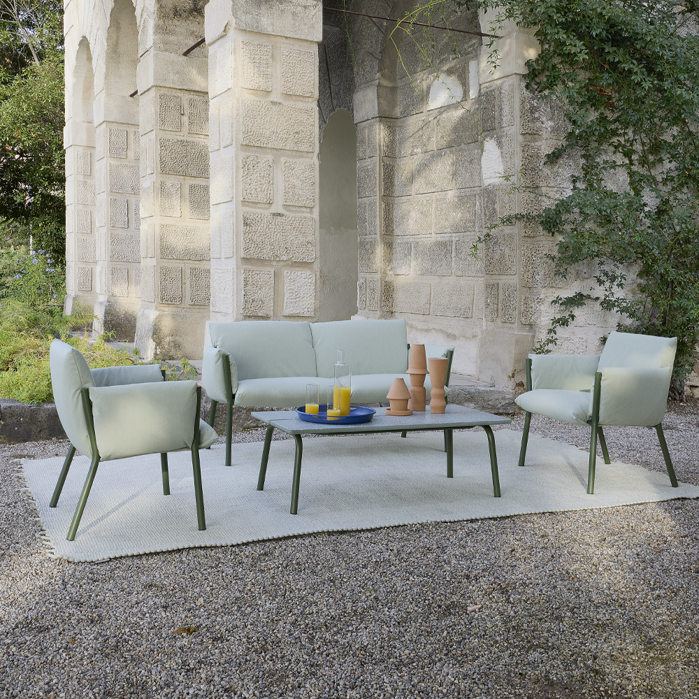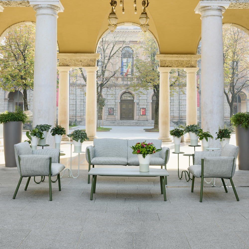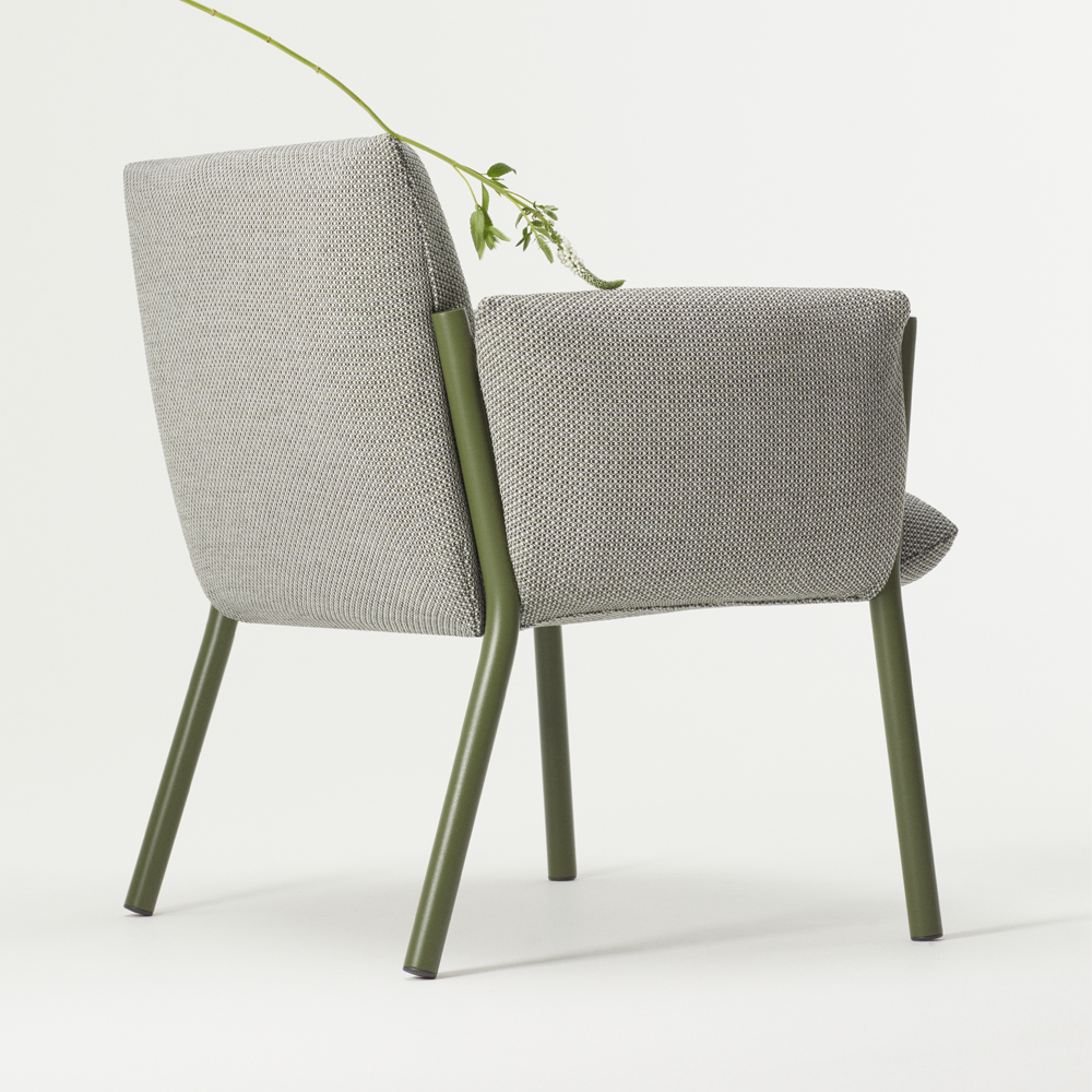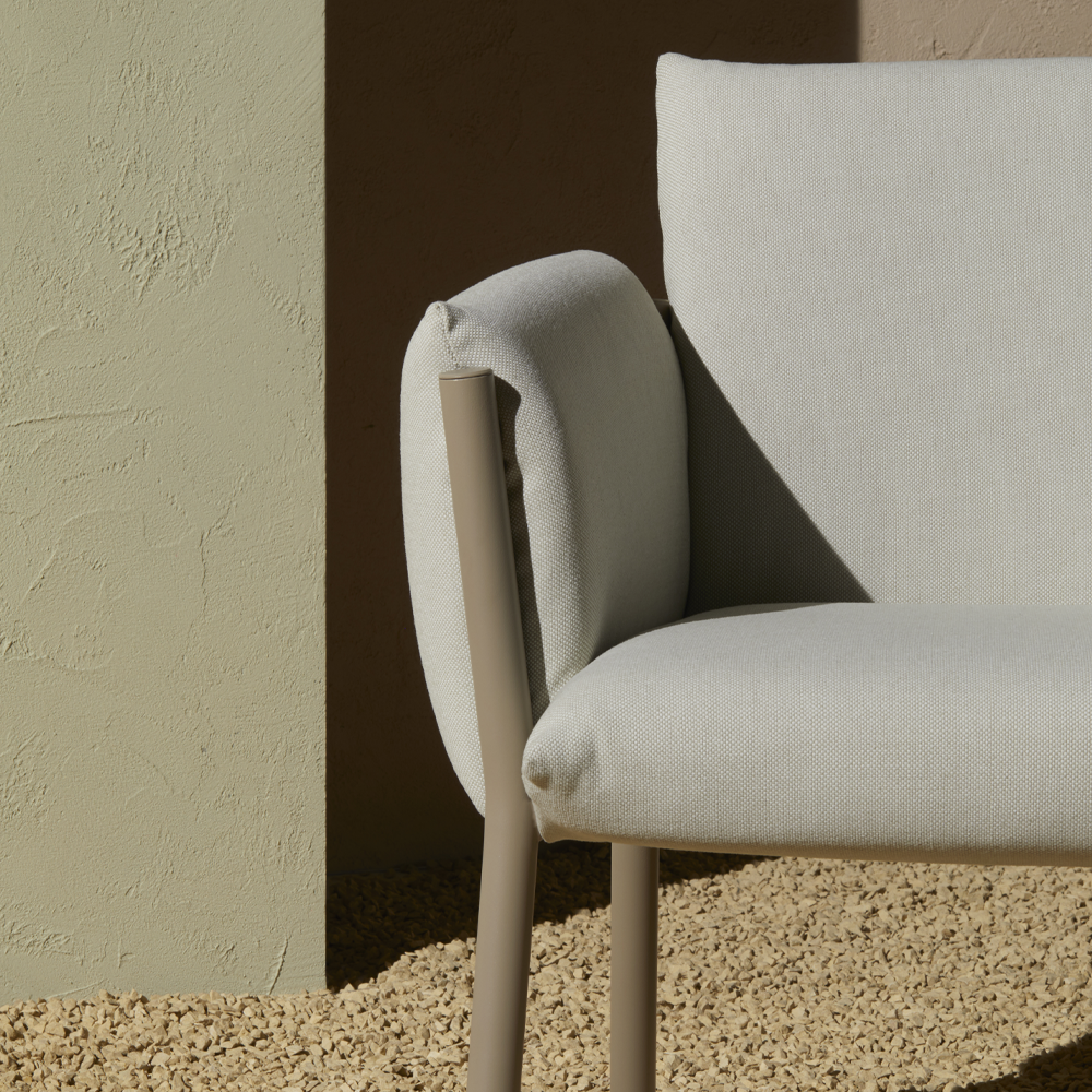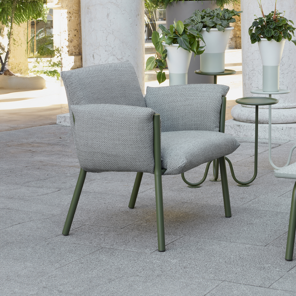 Poltrona lounge outdoor con seduta imbottita in più tipologie di tessuto e struttura in acciaio verniciato.