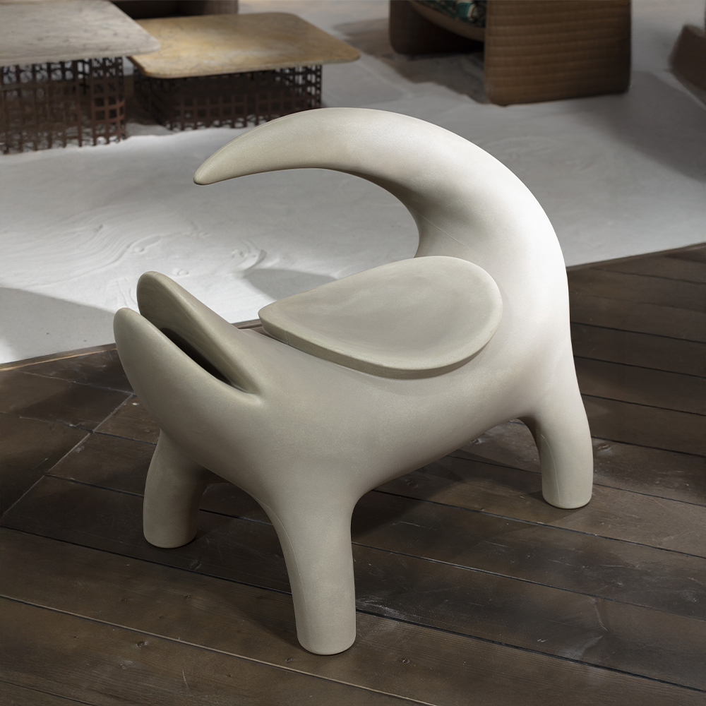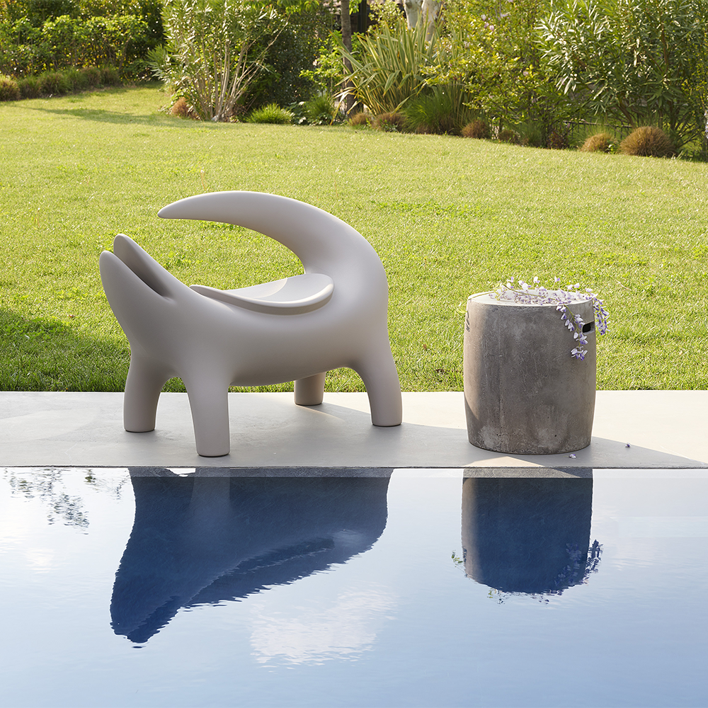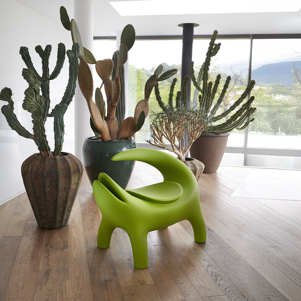 La poltrona Kroko, dal carattere deciso e dalle linee contemporanee, è realizzata in polietilene o in bio-polietilene di origine vegetale ricavato dalla canna da zucchero.