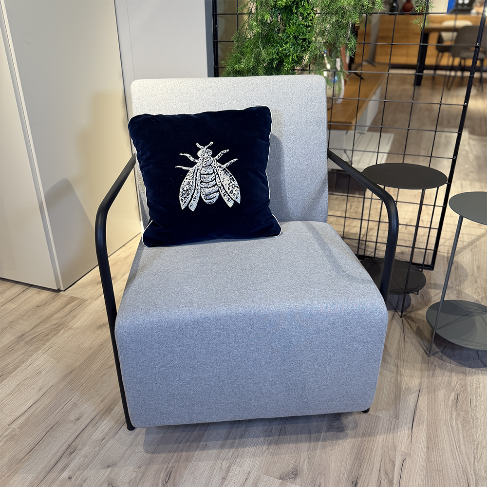 La struttura in metallo verniciato nero garantisce soliditร e un look contemporaneo, mentre la seduta imbottita, rivestita in tessuto grigio chiaro, offre un comfort avvolgente e una piacevole sensazione al tatto.