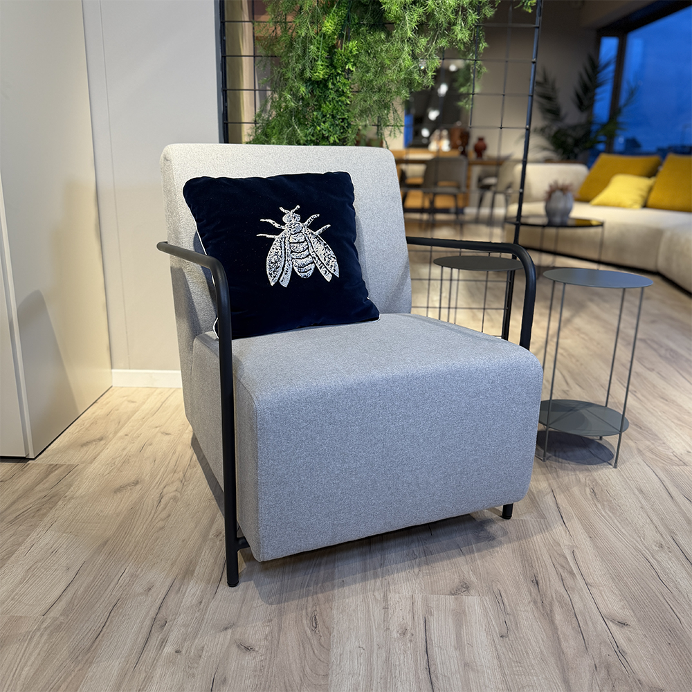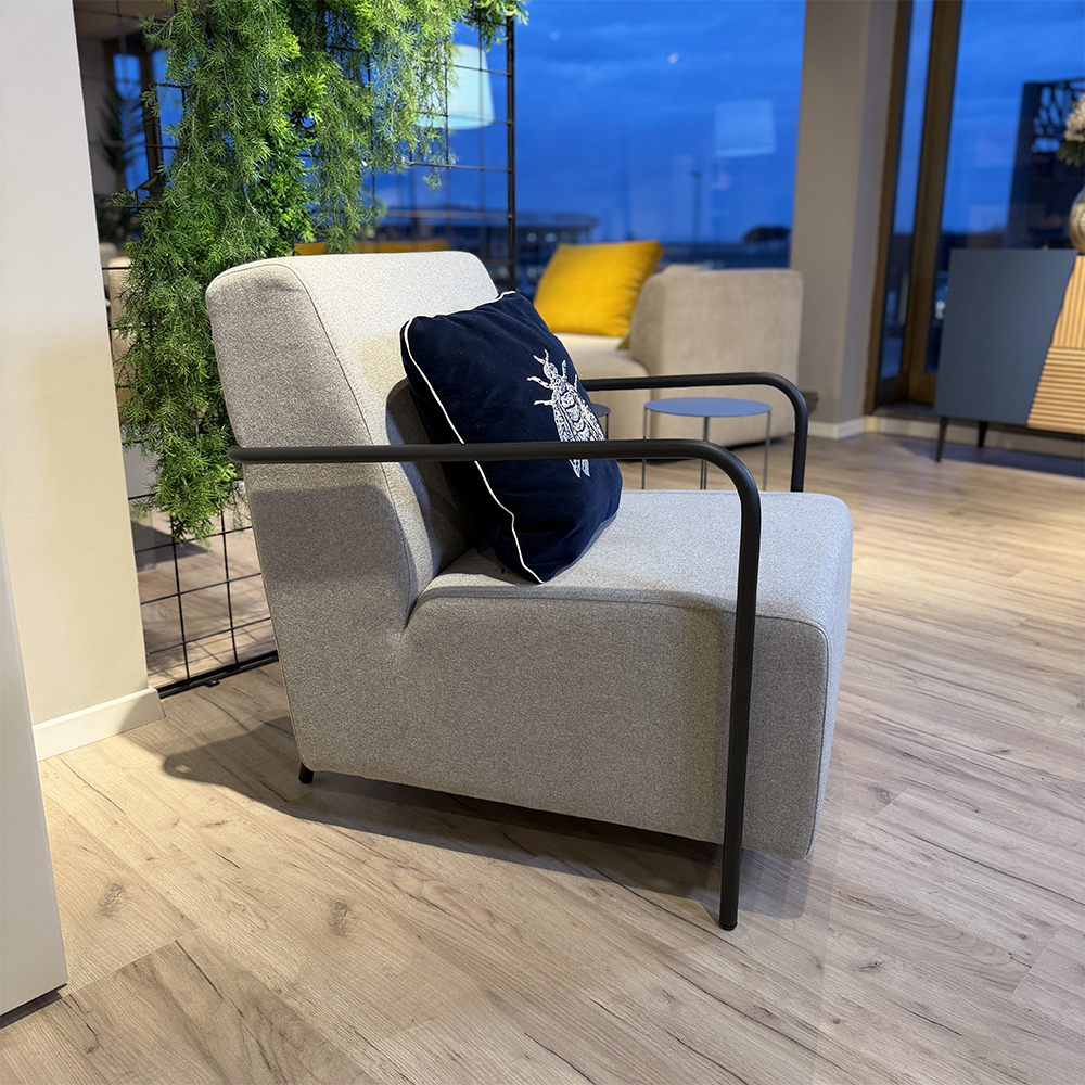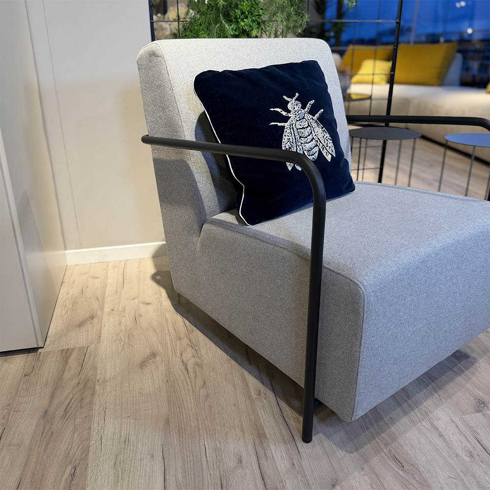 Poltrona con struttura in metallo nero e seduta imbottita rivestita in tessuto grigio chiaro.