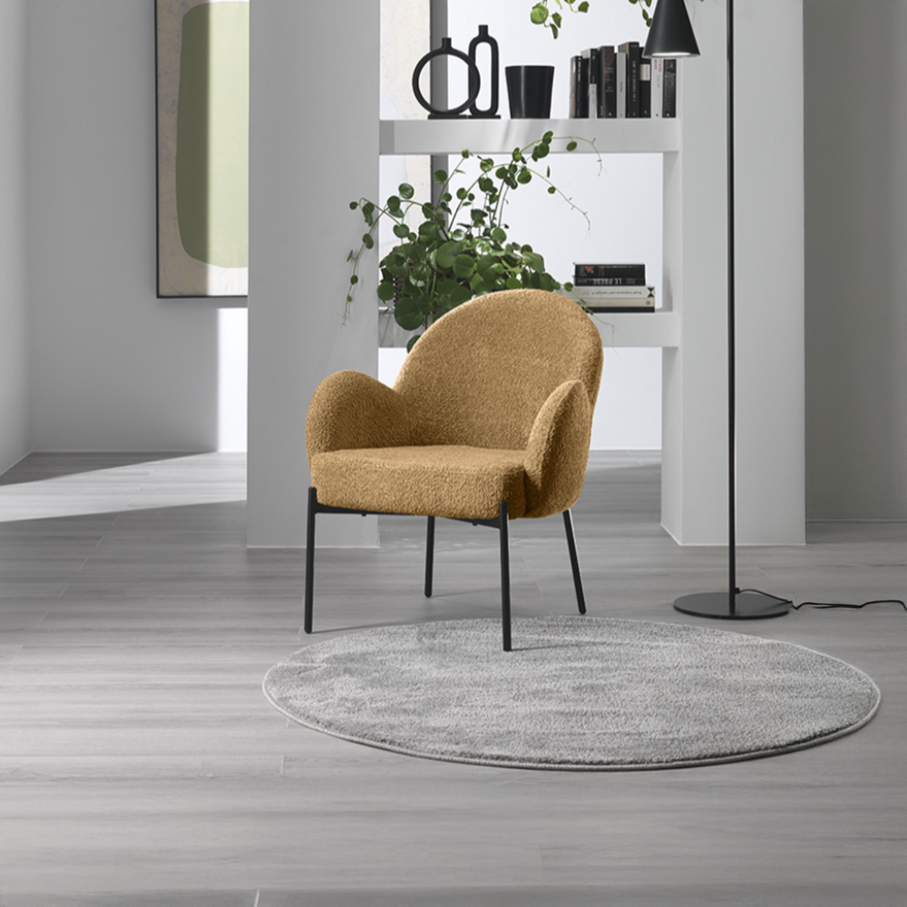 Il rivestimento in bouclé aggiunge una nota materica e visivamente calda, mentre la base in metallo garantisce stabilità e resistenza.