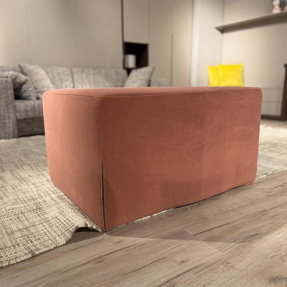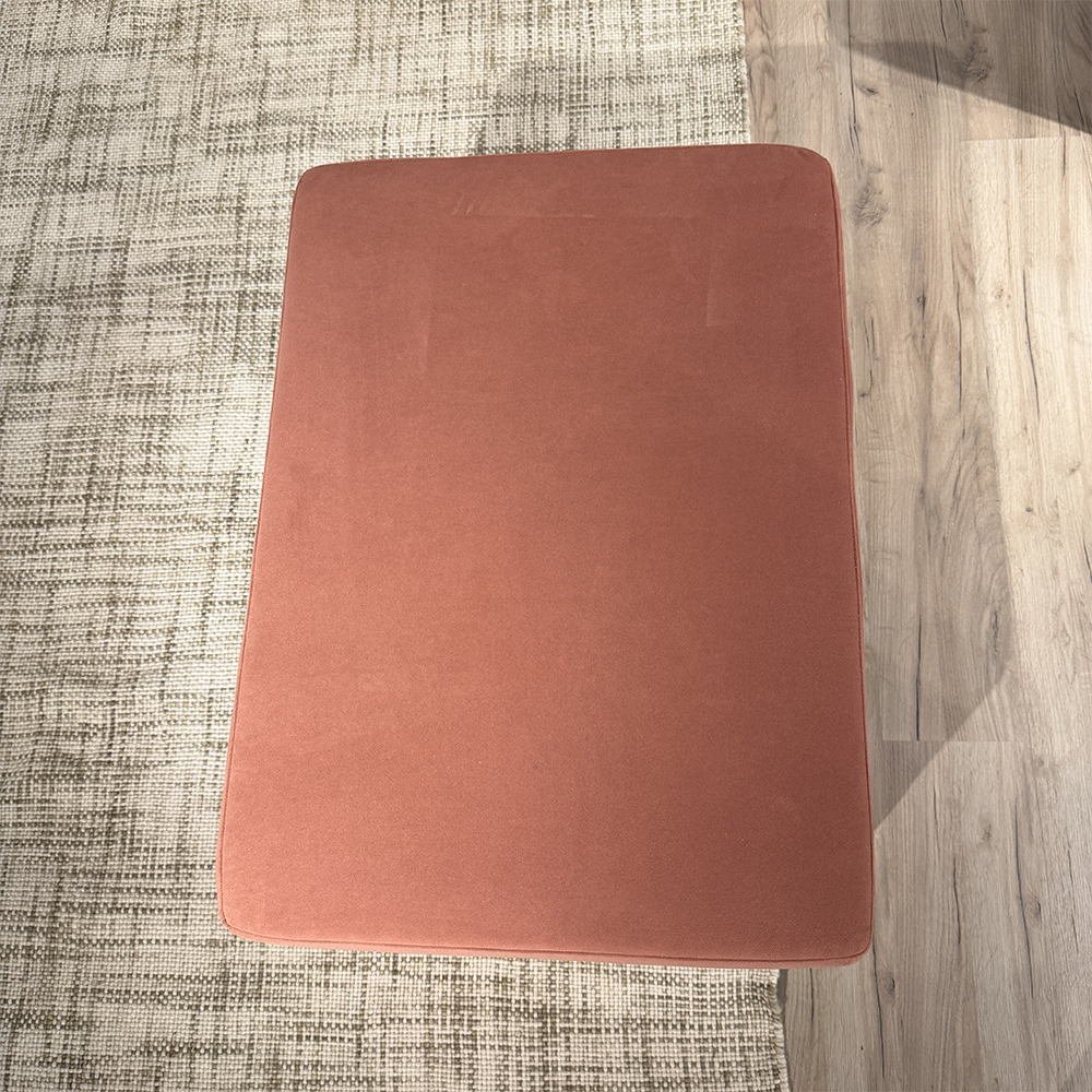 Pouf rettangolare imbottito rivestito in tessuto corallo.