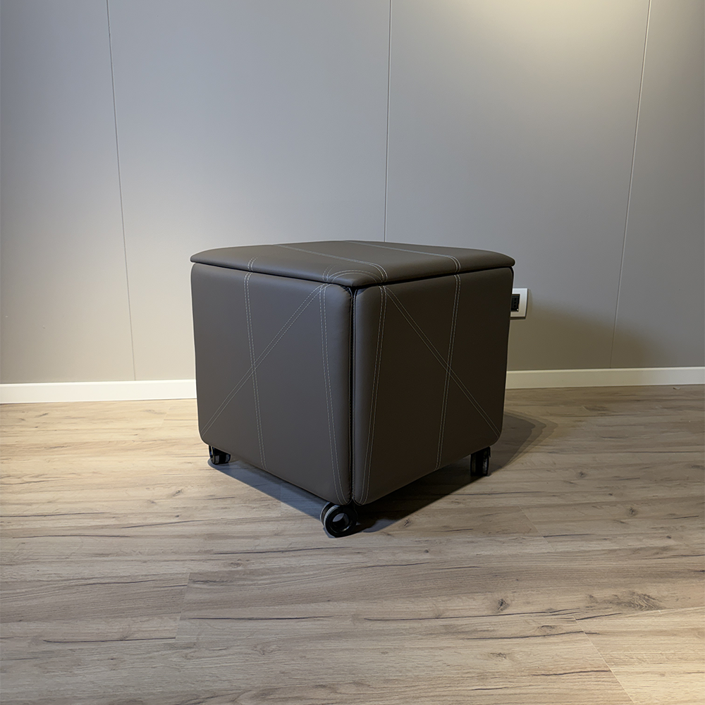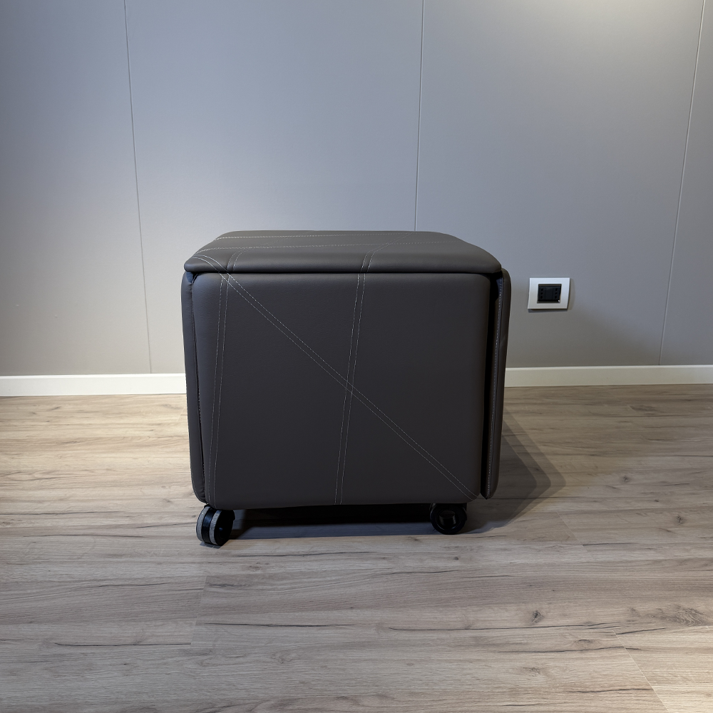 Si presenta come un pouf quadrato con ruote, facile da spostare e da inserire in diversi ambienti della casa.