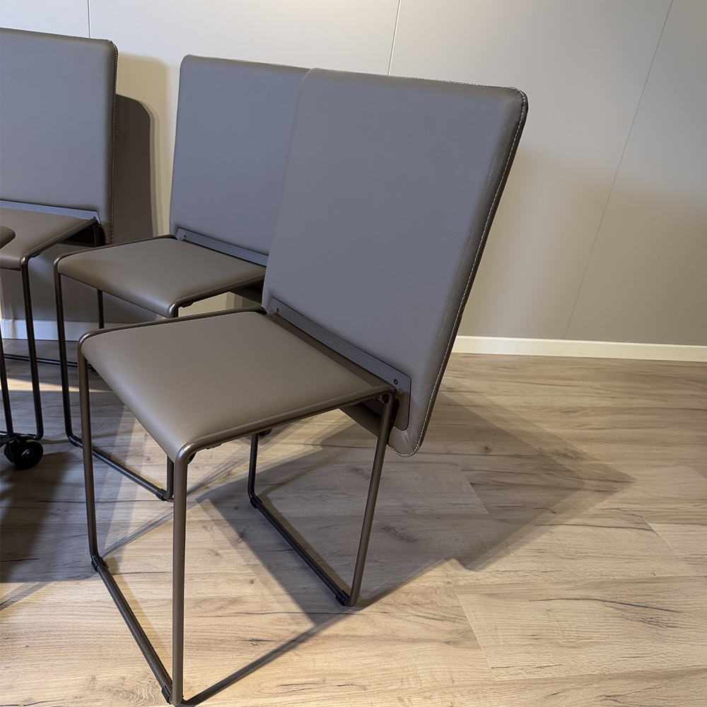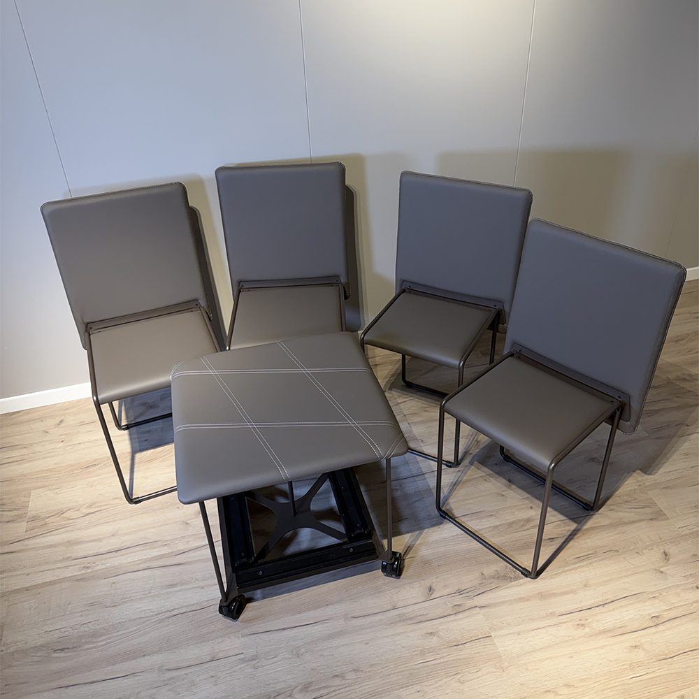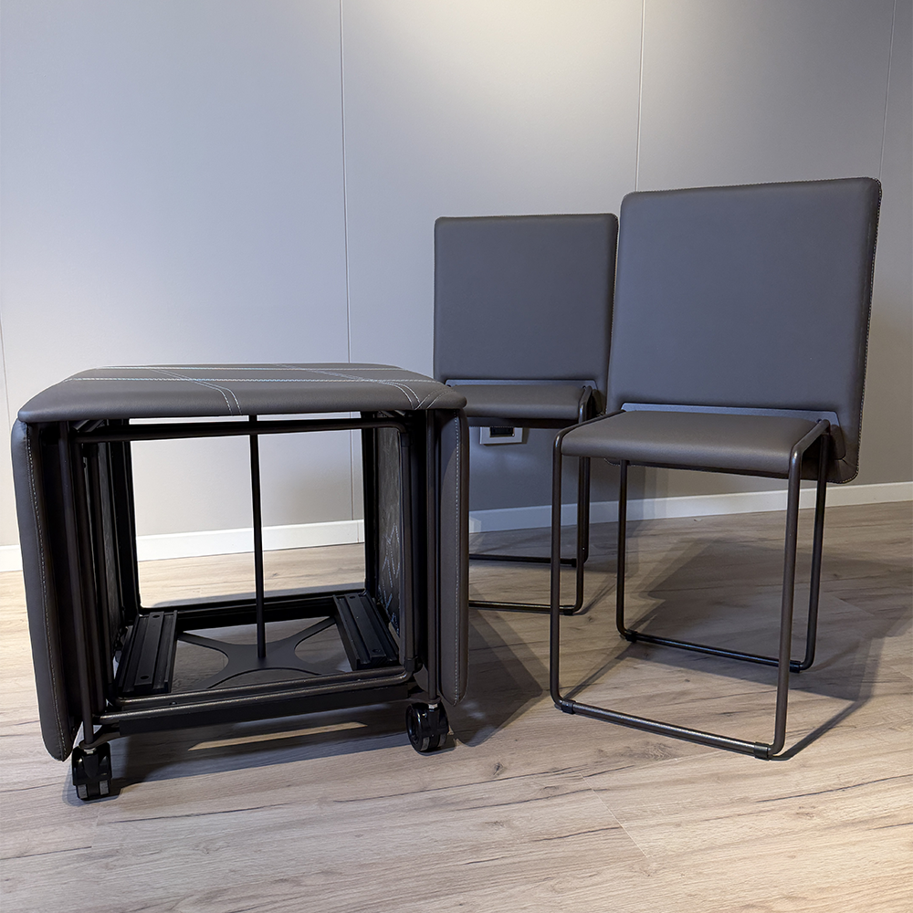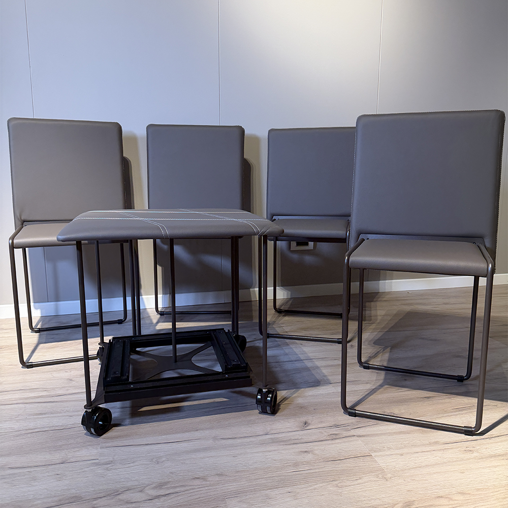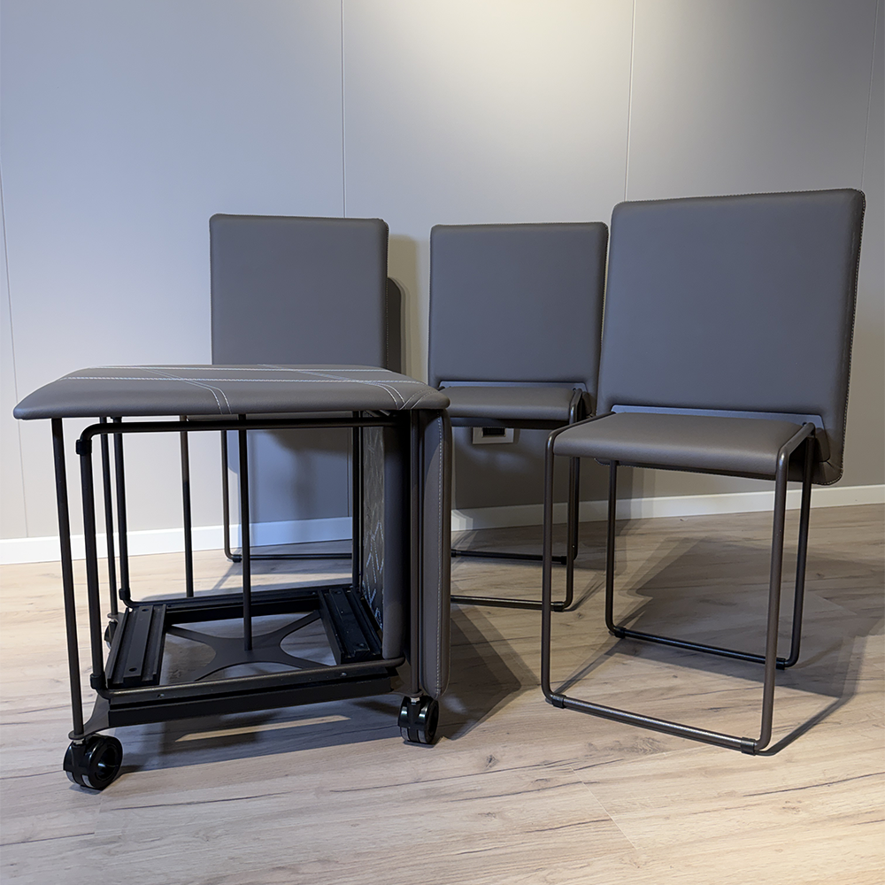 La sua struttura consente di trasformarlo rapidamente in un tavolino accompagnato da quattro sedie con schienale di due larghezze differenti.