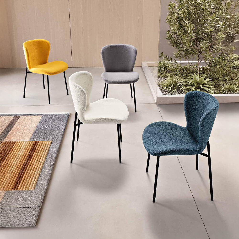La seduta e lo schienale sono imbottiti e rivestiti in tessuto bouclé, un materiale dall’aspetto materico e dalla superficie piacevole al tatto.