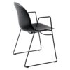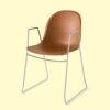 Sedia con braccioli, struttura a slitta in metallo e seduta in cuoio.