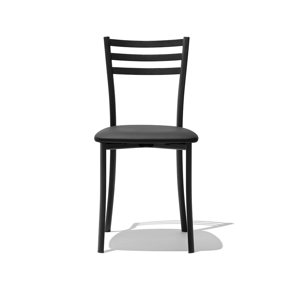 Sedia con struttura in metallo nero e seduta imbottita rivestita in similpelle nera.