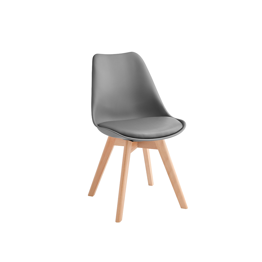 Sedia con gambe in legno di faggio e seduta imbottita e rivestita in similpelle grigia.
