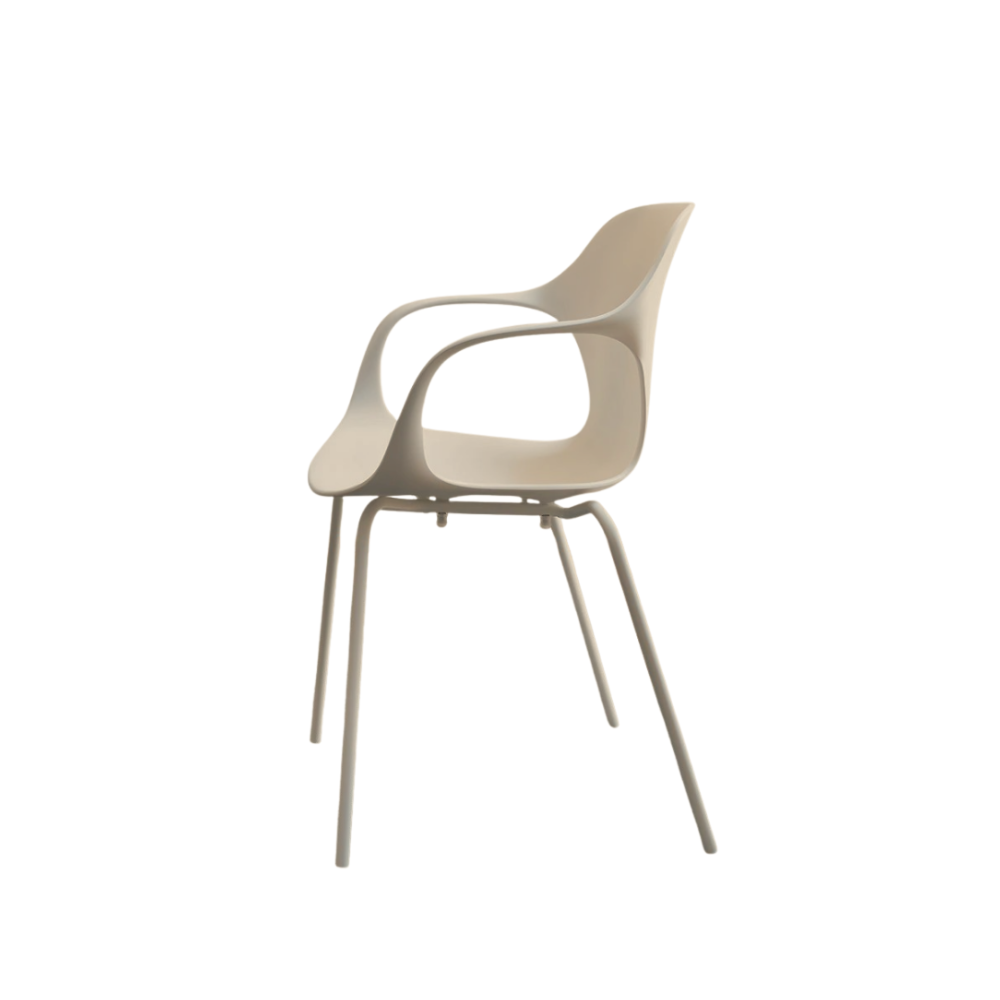 Sedia con braccioli con struttura in metallo verniciato canapa opaco e seduta in polipropilene dello stesso colore.