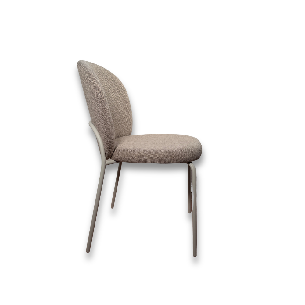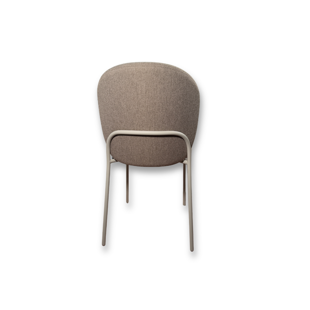 La seduta รจ imbottita e rivestita in tessuto tecnico tortora, applicato in modo da mantenere la tensione e lโestetica nel tempo.