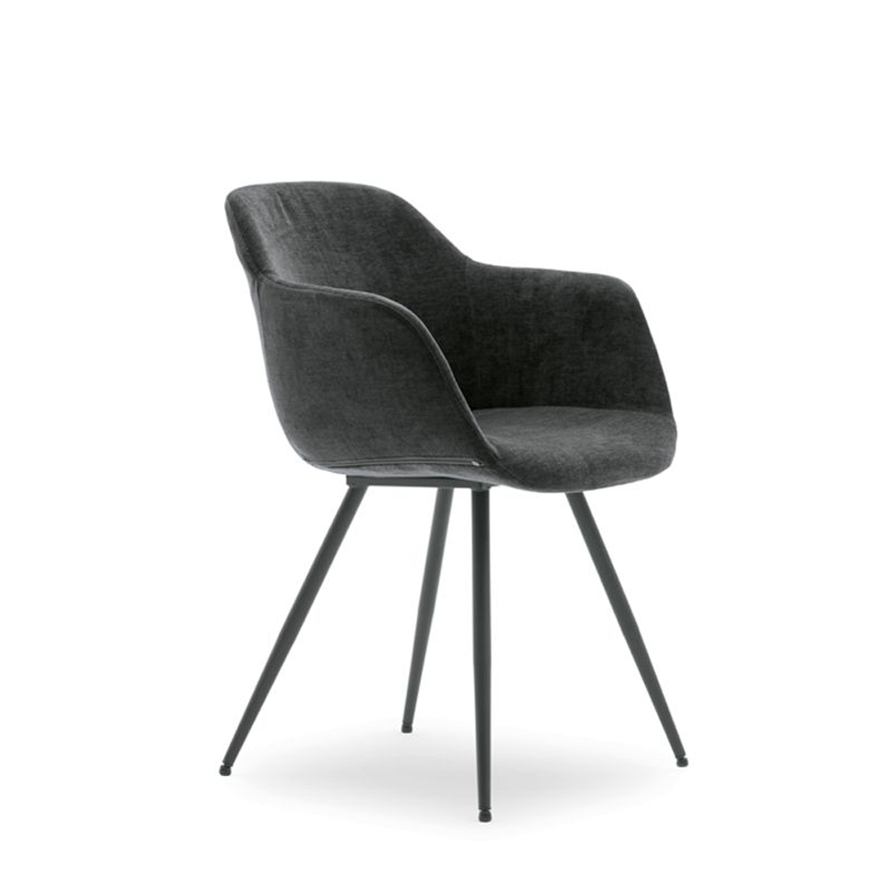 La sedia Dreamy presenta una struttura in metallo verniciato nero, abbinata ad una seduta in tessuto grigio, progettata per offrire comfort e funzionalitร .