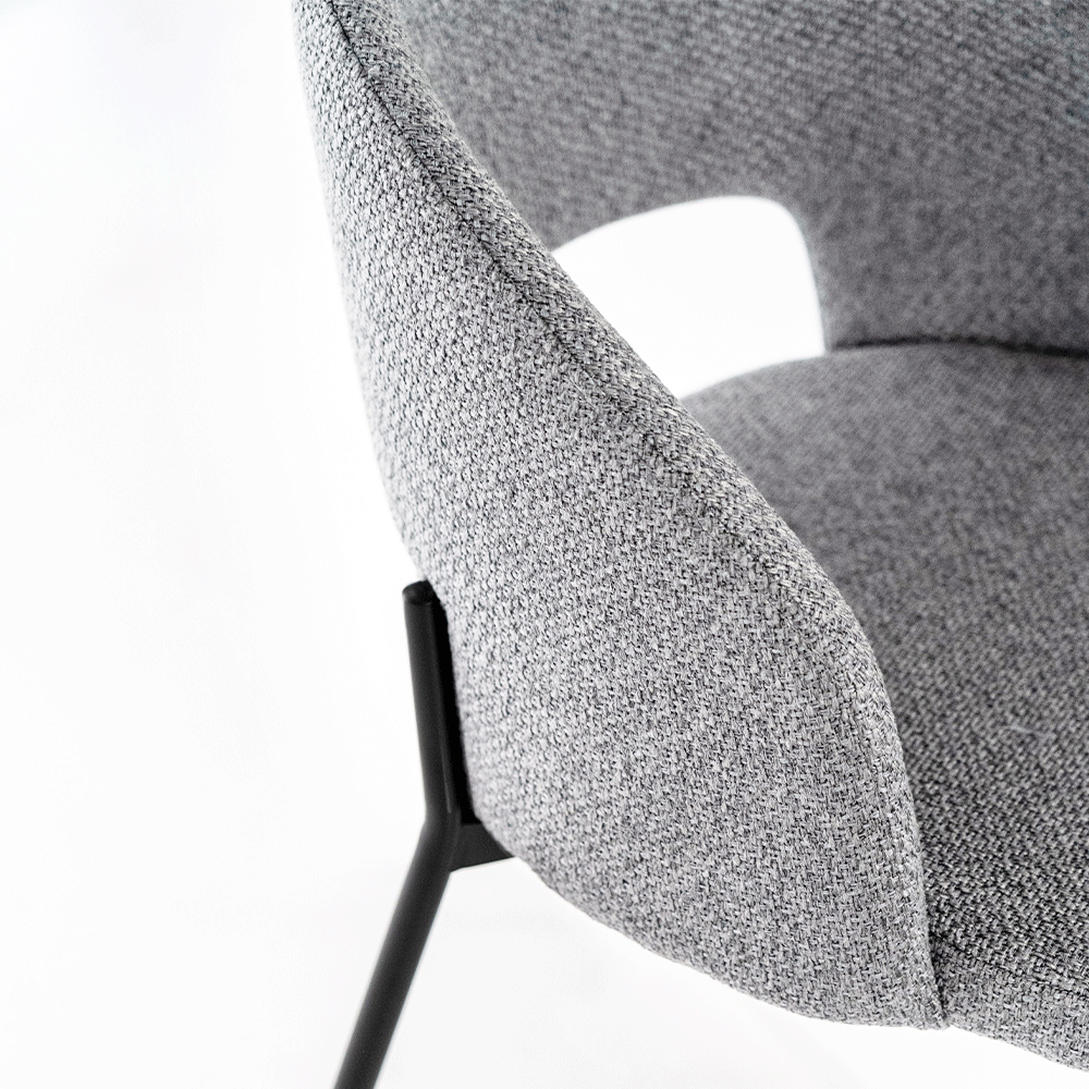 Sedia con struttura in metallo verniciato antracite e seduta in tessuto grigio chiaro.